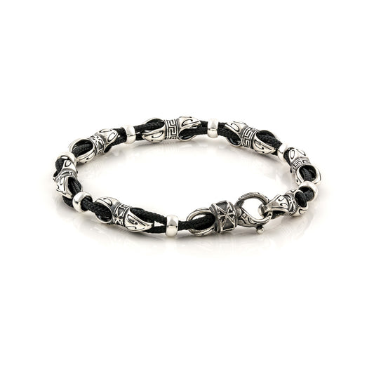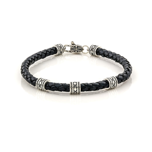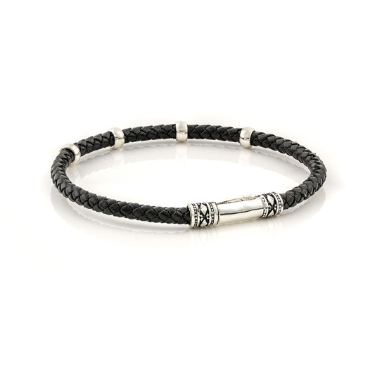Ασημένιο βραχιόλι με κομψά ασημένια μοτιφ και γνήσιο πλεκτό δέρμα