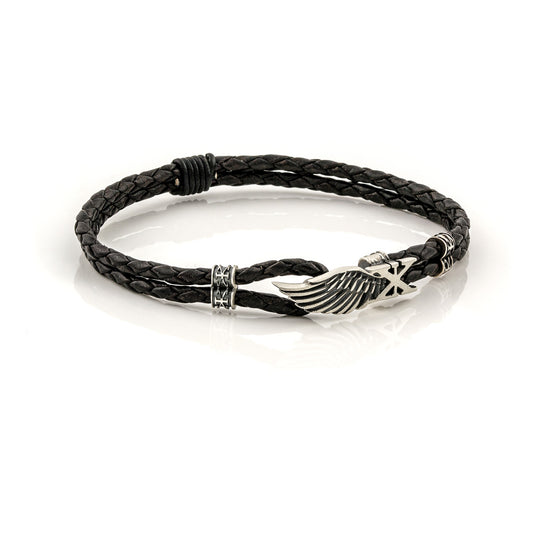 Ασημένιο βραχιόλι με μοτίφ φτερό, και σώμα από γνήσιο πλεκτό δέρμα