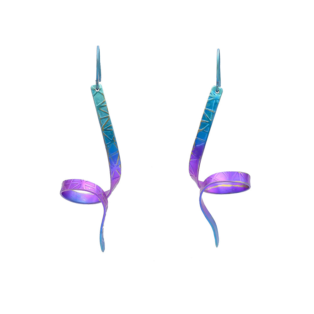 Ανάγλυφα σκουλαρίκια από ανοδιωμένο τιτάνιο, σε αέρινο σχήμα, που εναρμονίζεται άψογα με τις κινήσεις του κεφαλιού και το σχήμα του προσώπου