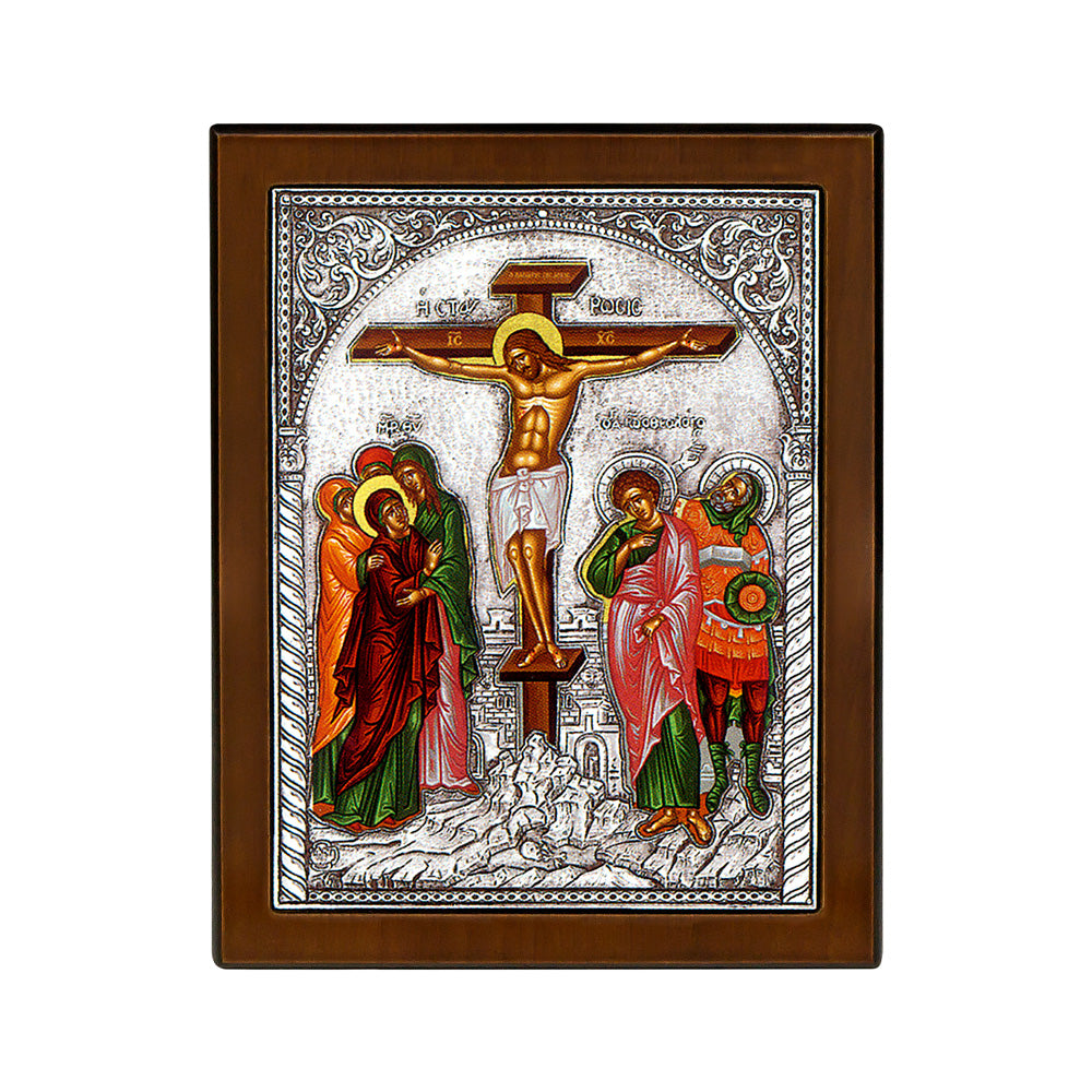 Ασημένια εικόνα 925ο «η Σταύρωση» σε αγιογραφία, με όμορφη ξύλινη πλάτη με στήριγμα και ηλεκτροστατικό βερνίκι για έξτρα προστασία.