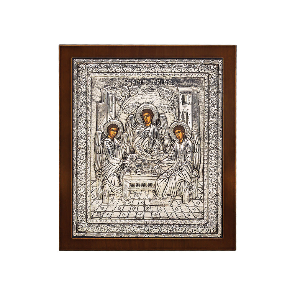 Ασημένια εικόνα 925ο με την Αγία Τριάδα σε όμορφη ξύλινη πλάτη σε λευκό και καφέ χρώμα.