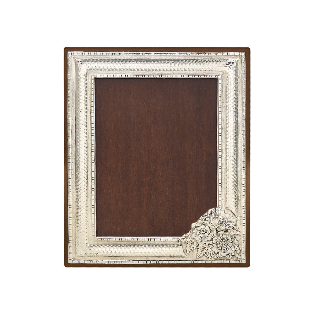 Όμορφη ασημένια κορνίζα 925ο με λευκούς τόνους και μία λεπτομέρεια από άνθη, σε ξύλινη πλάτη.