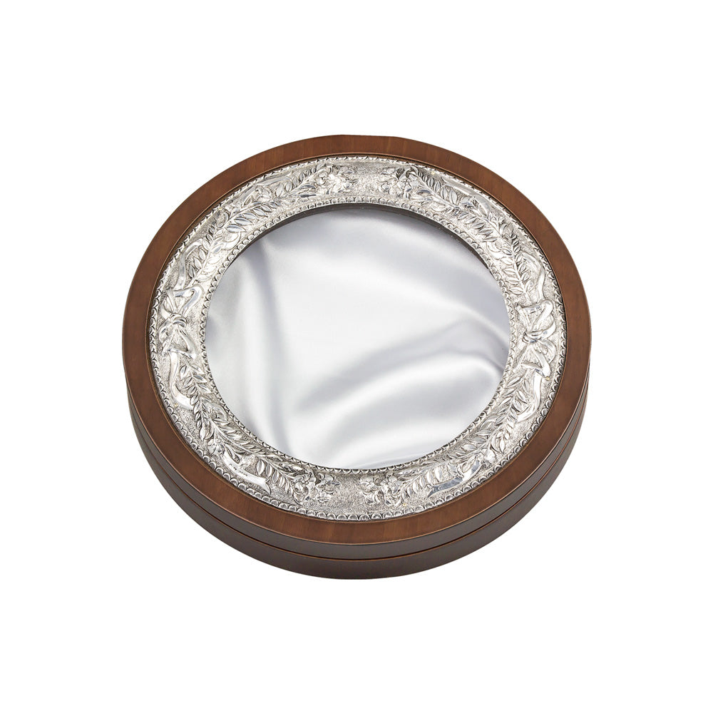 Ασημένια στεφανοθήκη σε μοντέρνο στρογγυλό σχήμα με ρομαντικά σχέδια