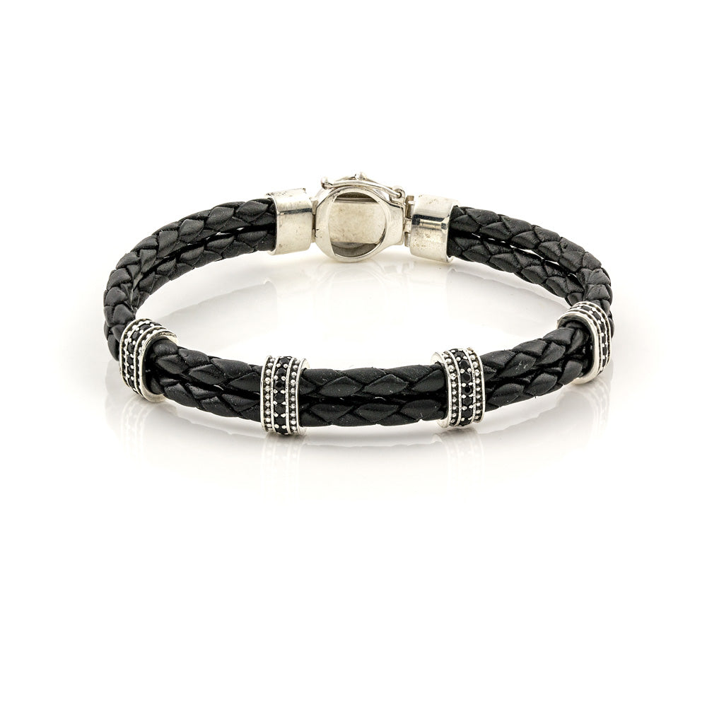 Ασημένιο βραχιόλι 925ο από γνήσιο πλεκτό δέρμα με πρόσθετα μαύρα ζιργκόν, που σαγηνεύει με τον κομψό του σχεδιασμό.