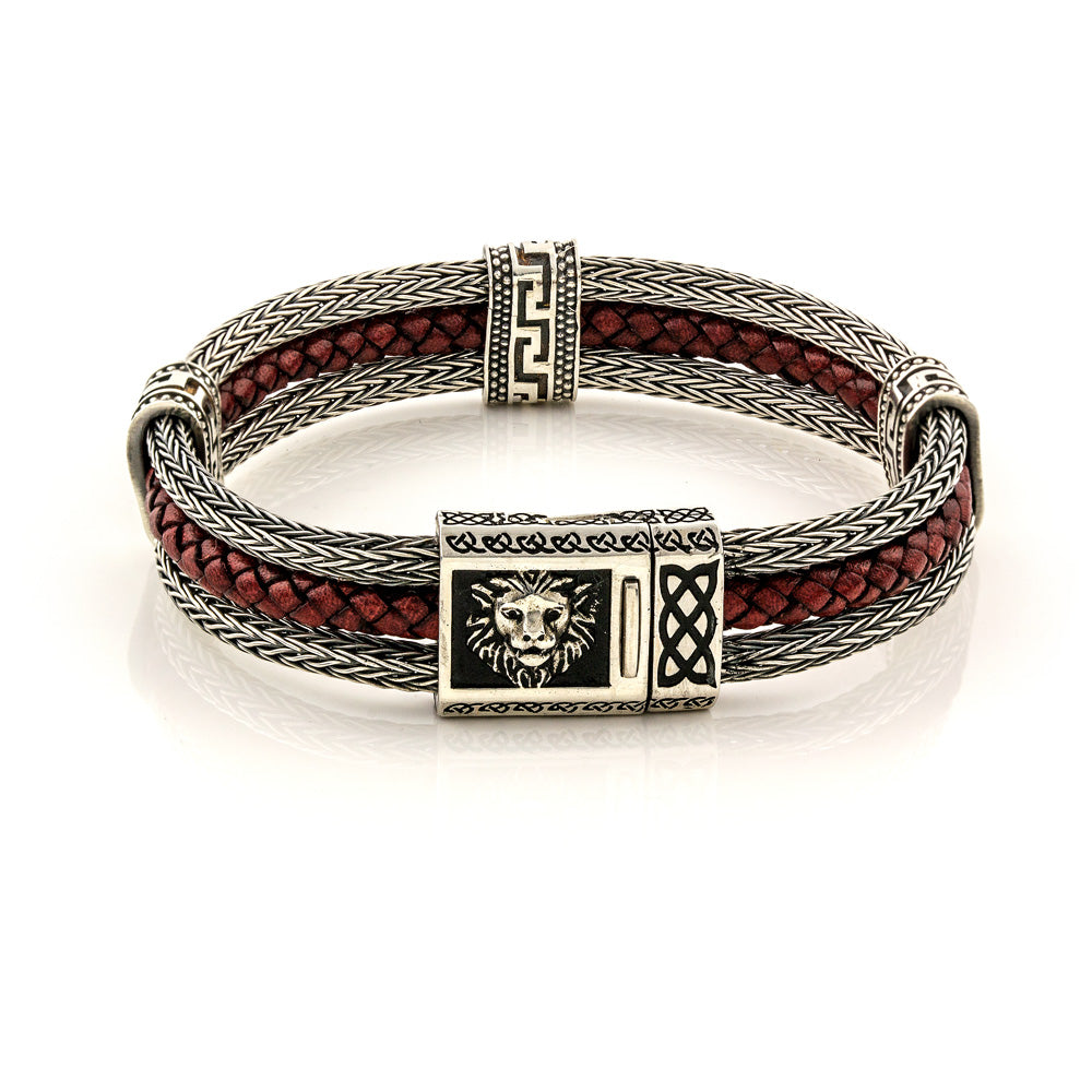 Ασημένιο βραχιόλι 925ο με κούμπωμα σε σχέδιο λιονταριού και με γνήσιο κόκκινο δέρμα, ιδανικό για δώρο είτε στον εαυτό σας, είτε σε έναν άντρα με έντονο και αγαπητό ρόλο στη ζωή σας.
