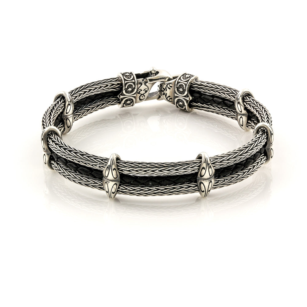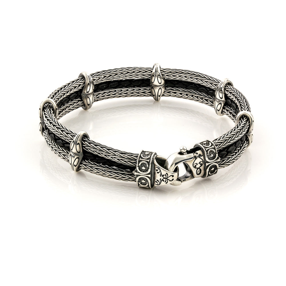Ασημένιο βραχιόλι 925ο με περίτεχνες ασημένιες προσθήκες και σώμα από γνήσιο μαύρο δέρμα, για επιβλητικές εμφανίσεις.