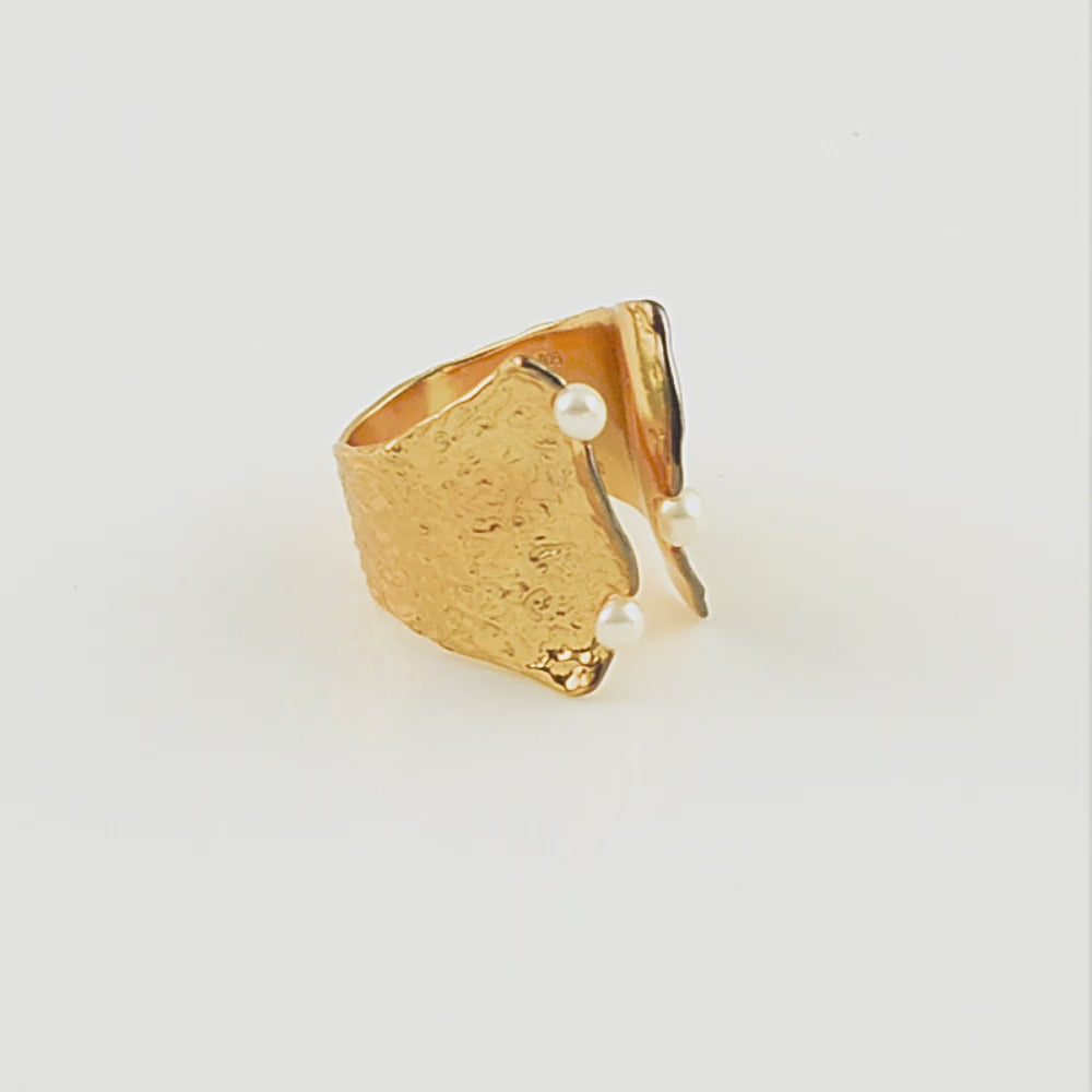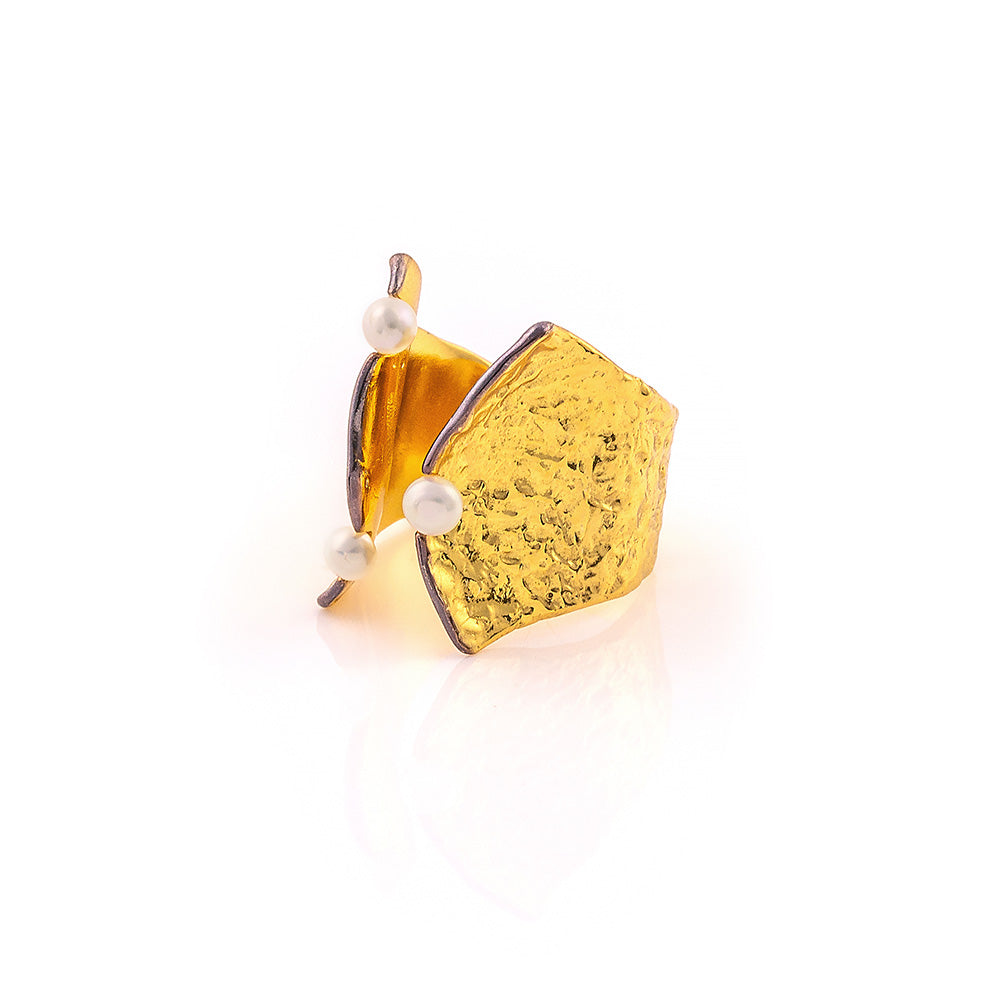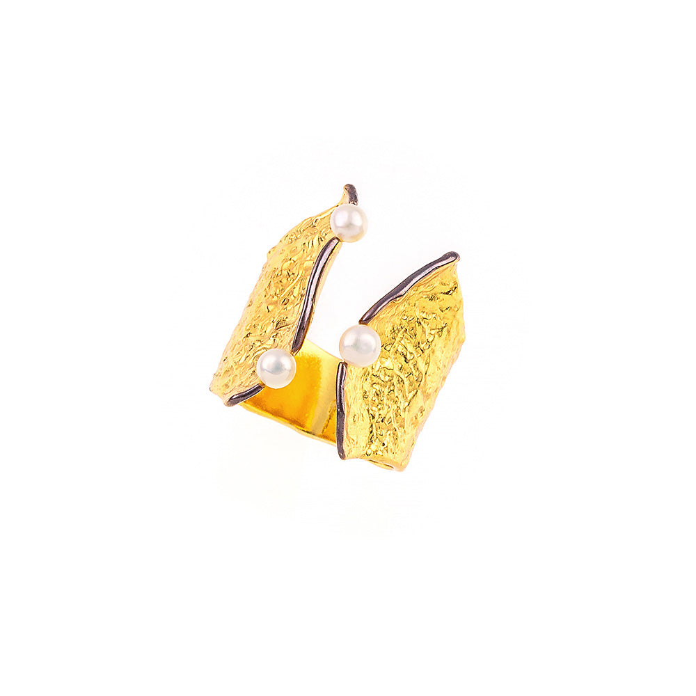 Ασημένιο δαχτυλίδι 925ο με ιδιαίτερη σπασμένη επιφάνεια και μαύρη λεπτομέρεια στο τελείωμα, που δίνει μία υπέροχη διχρωμία. Φιλοξενεί επίσης τρία μικρά μαργαριτάρια του γλυκού νερού.
