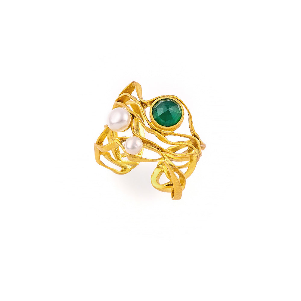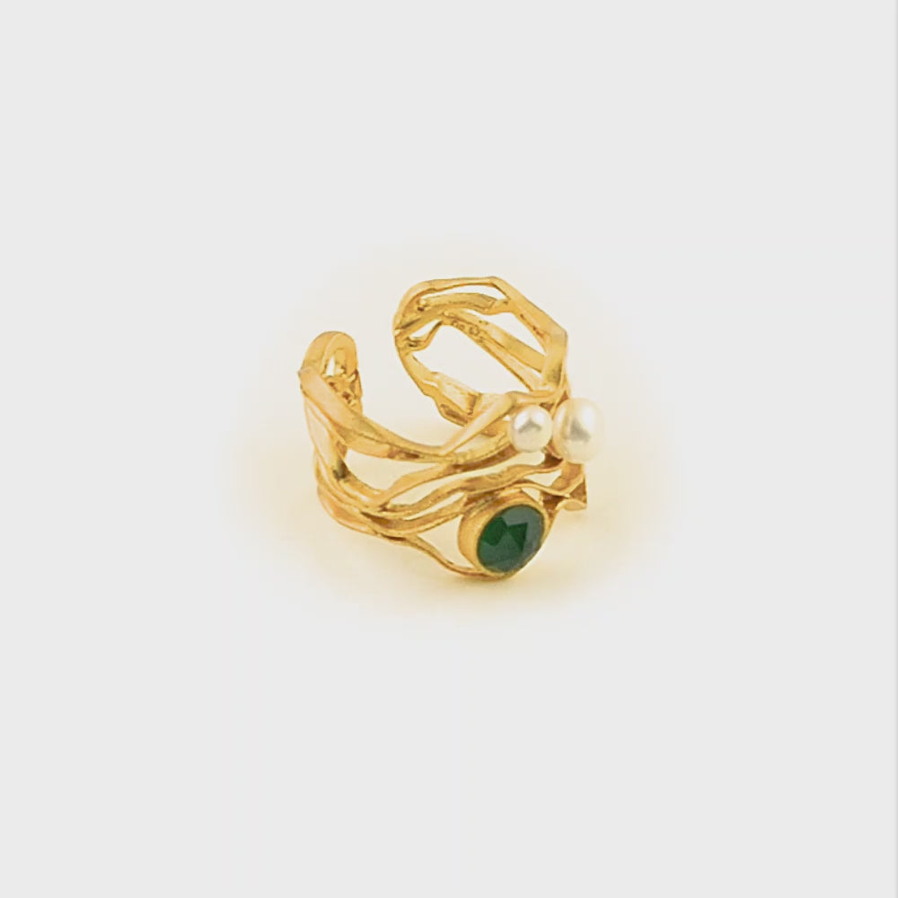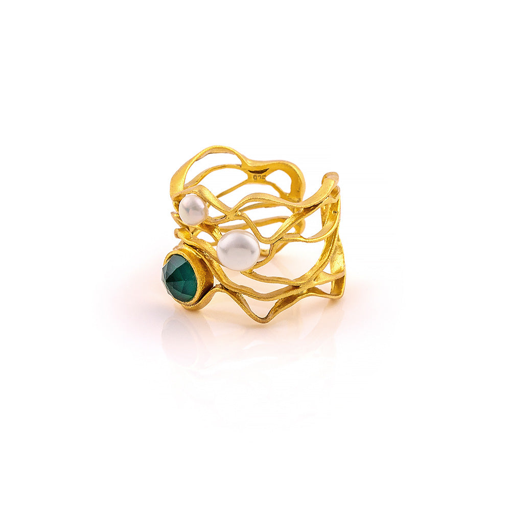 Ασημένιο δαχτυλίδι 925ο σε πρωτότυπο κυματιστό σχεδιασμό, που αγκαλιάζει δύο μαργαριτάρια του γλυκού νερού και στολίζεται από έναν πανέμορφο πράσινο αχάτη.