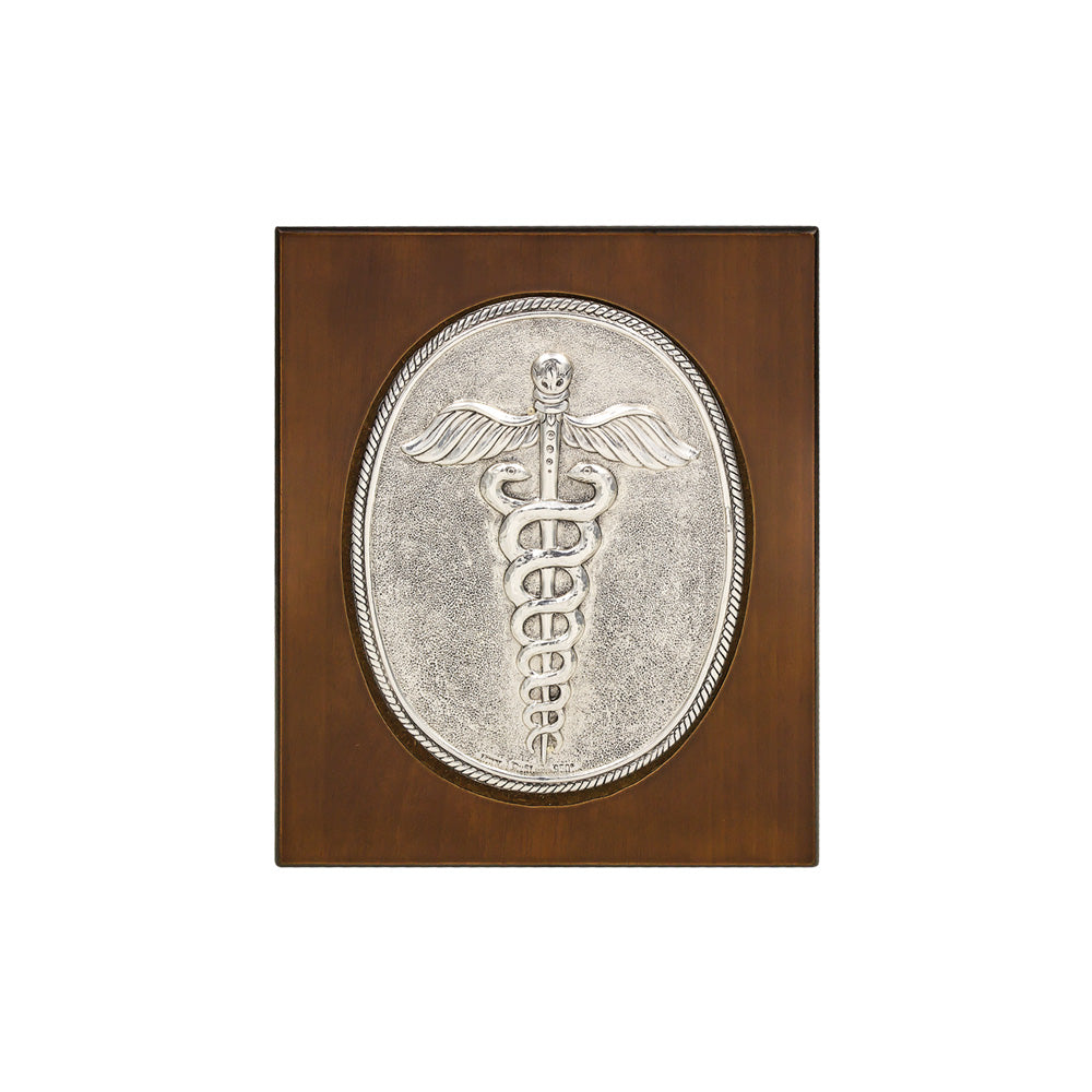 Ασημένιο ιατρικό σήμα μέσα σε ξύλινο κάδρο.