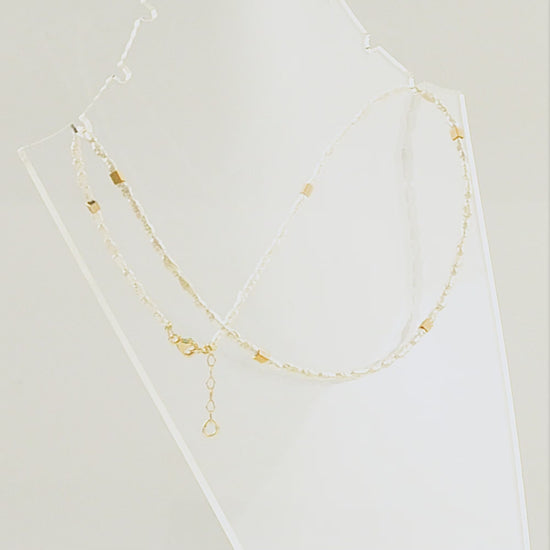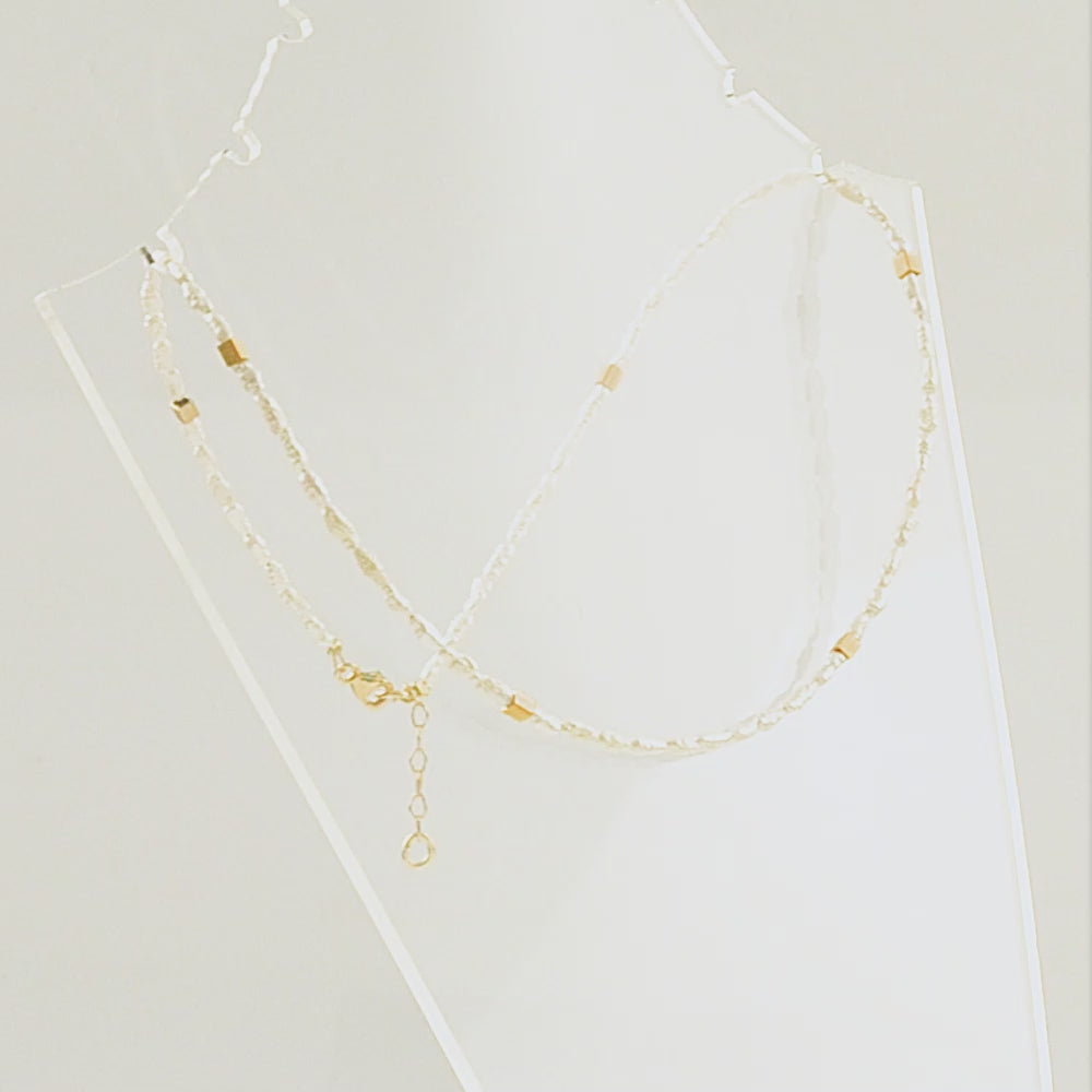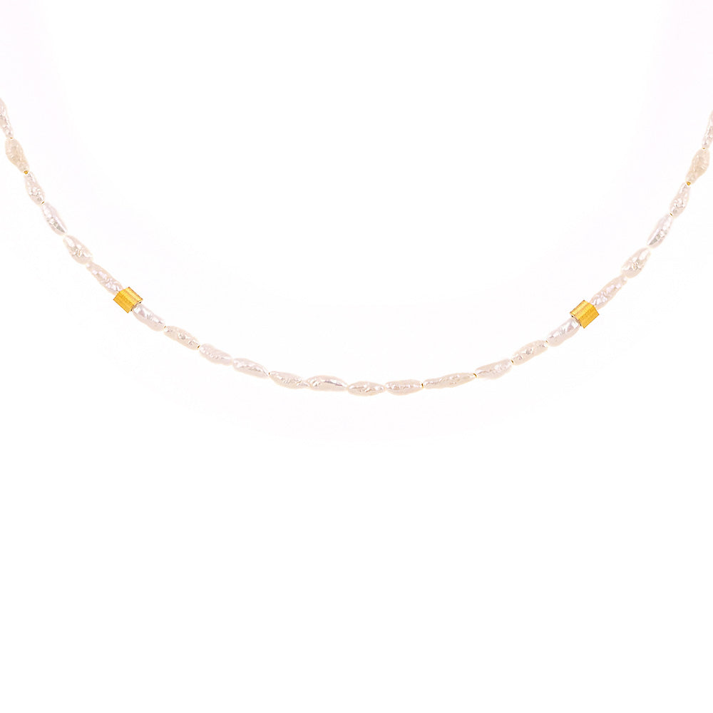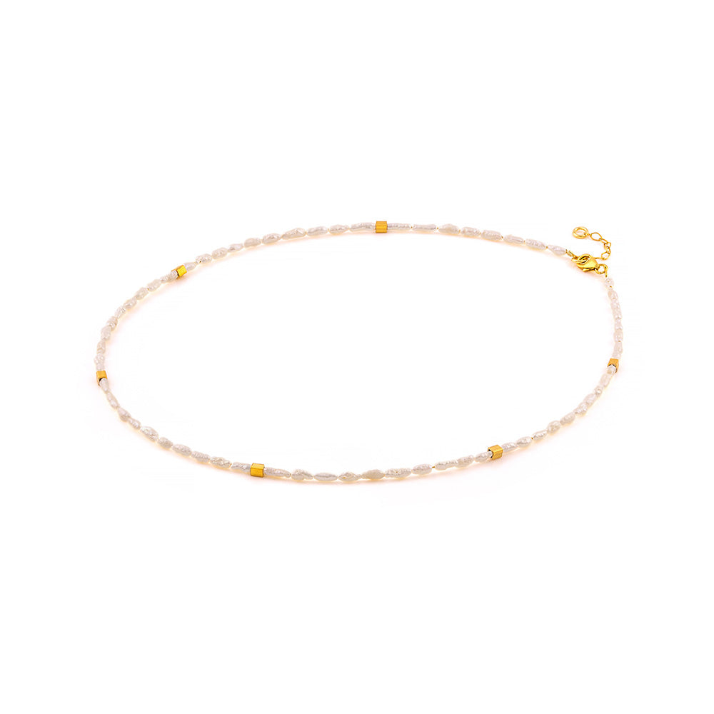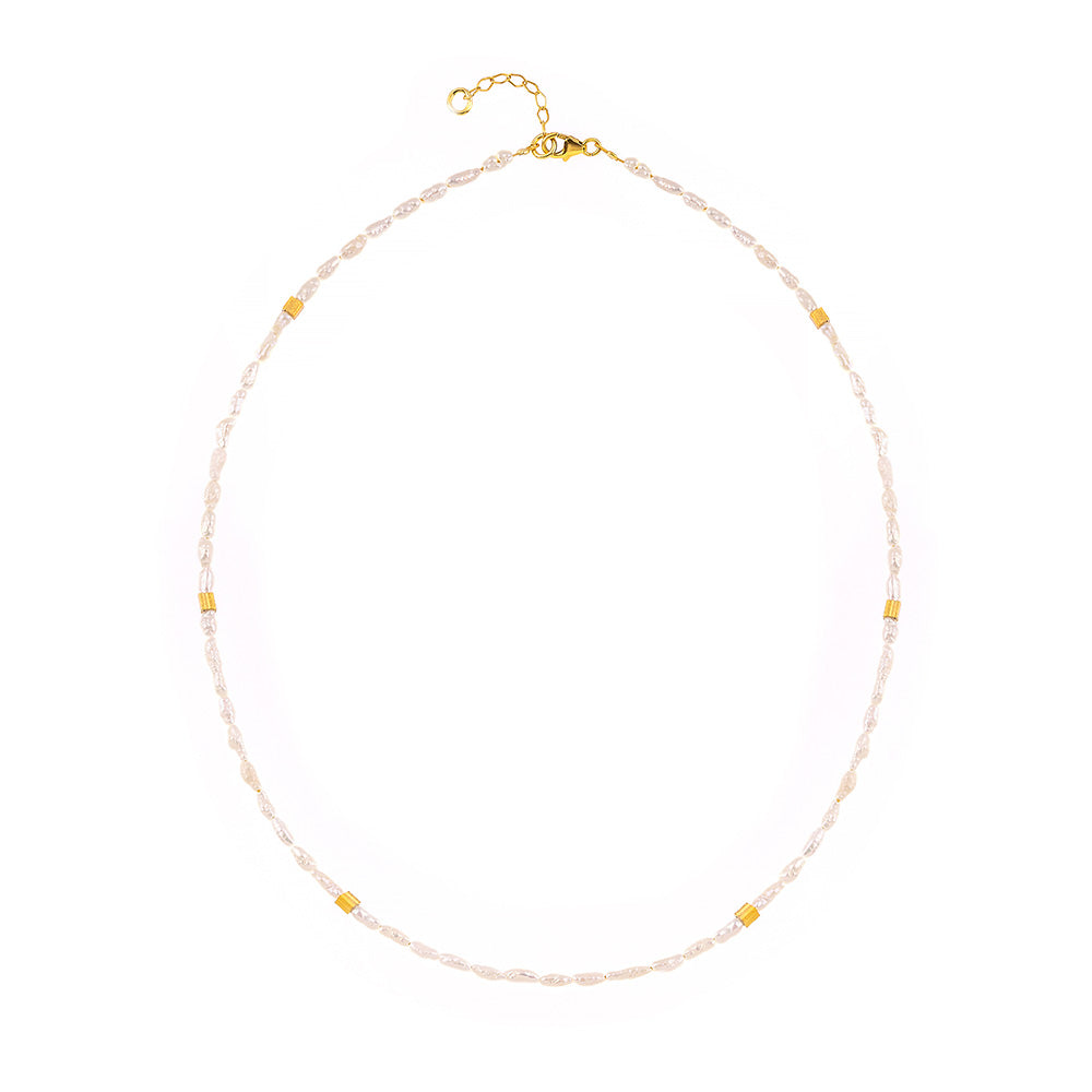Ασημένιο κολιέ 925ο, από μαργαριτάρια του γλυκού νερού σε μοντέρνο σχήμα, τα οποία σε συνδυασμό με τις επιχρυσωμένες λεπτομέρειες του κοσμήματος, αναδεικνύουν μία μοναδική χάρη.