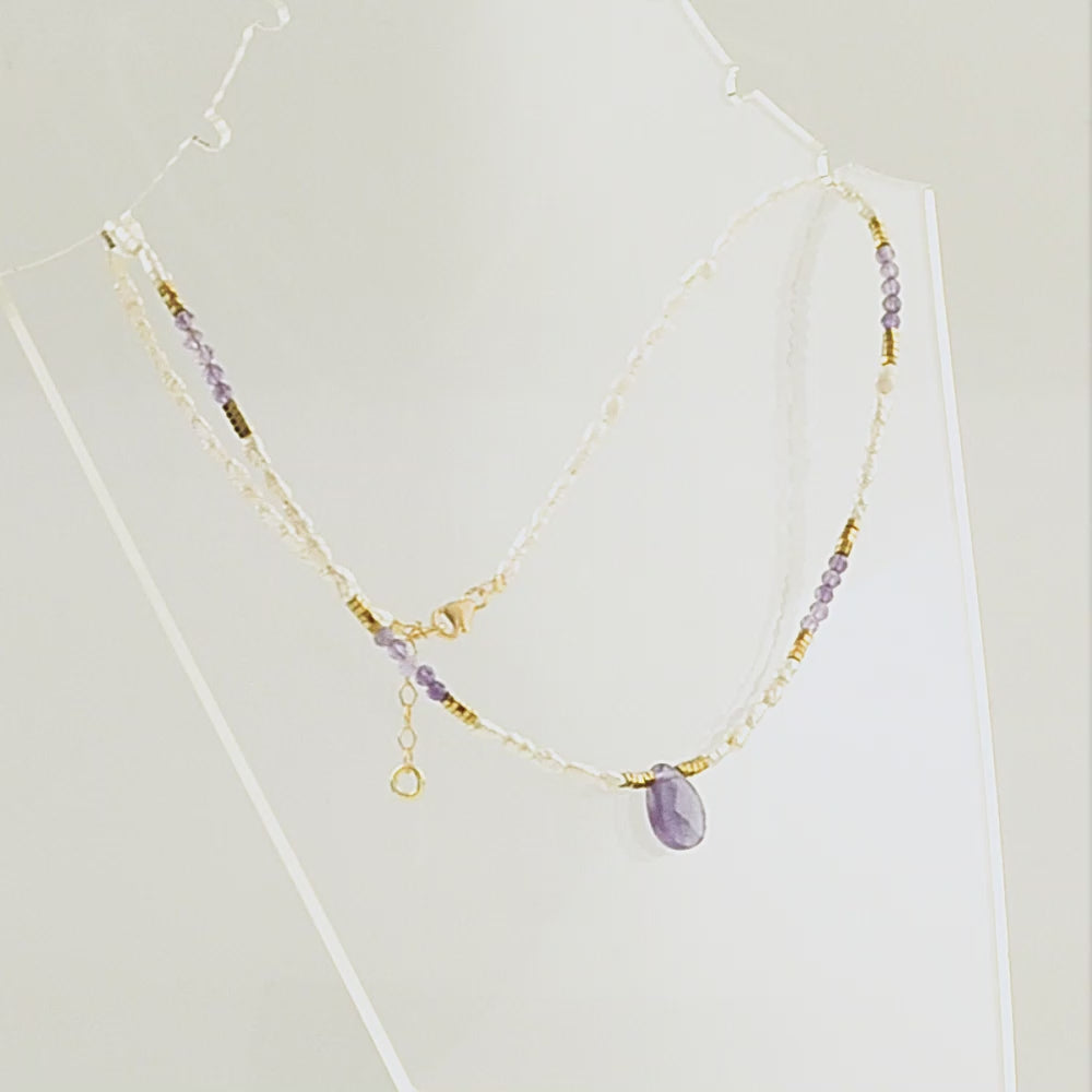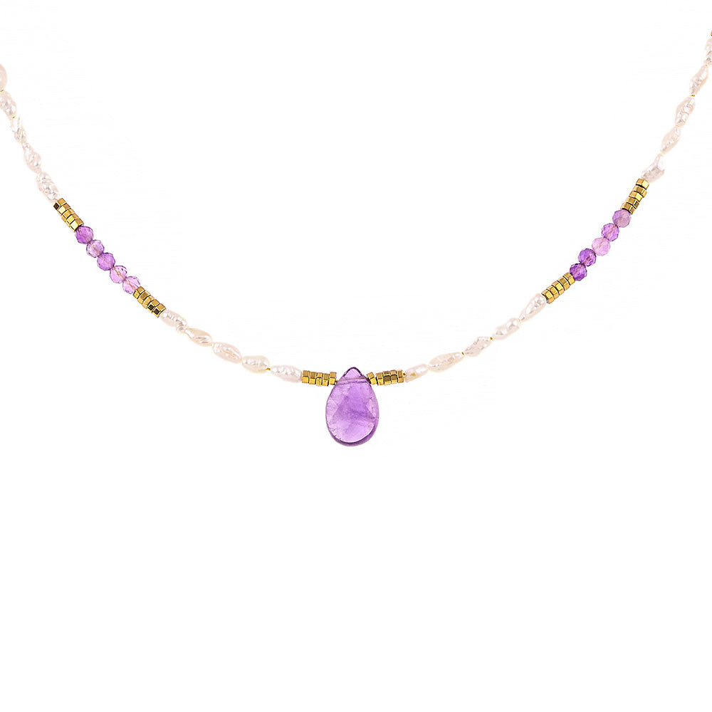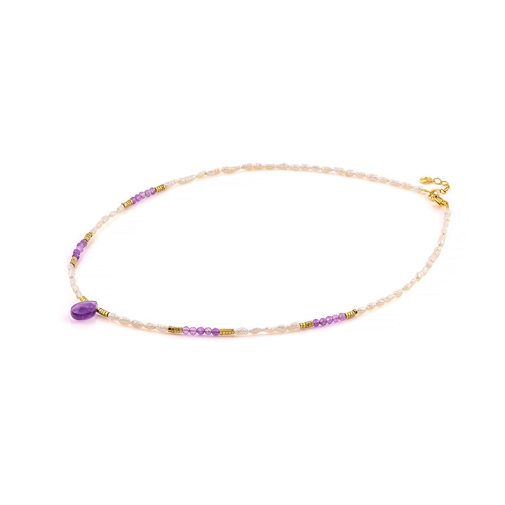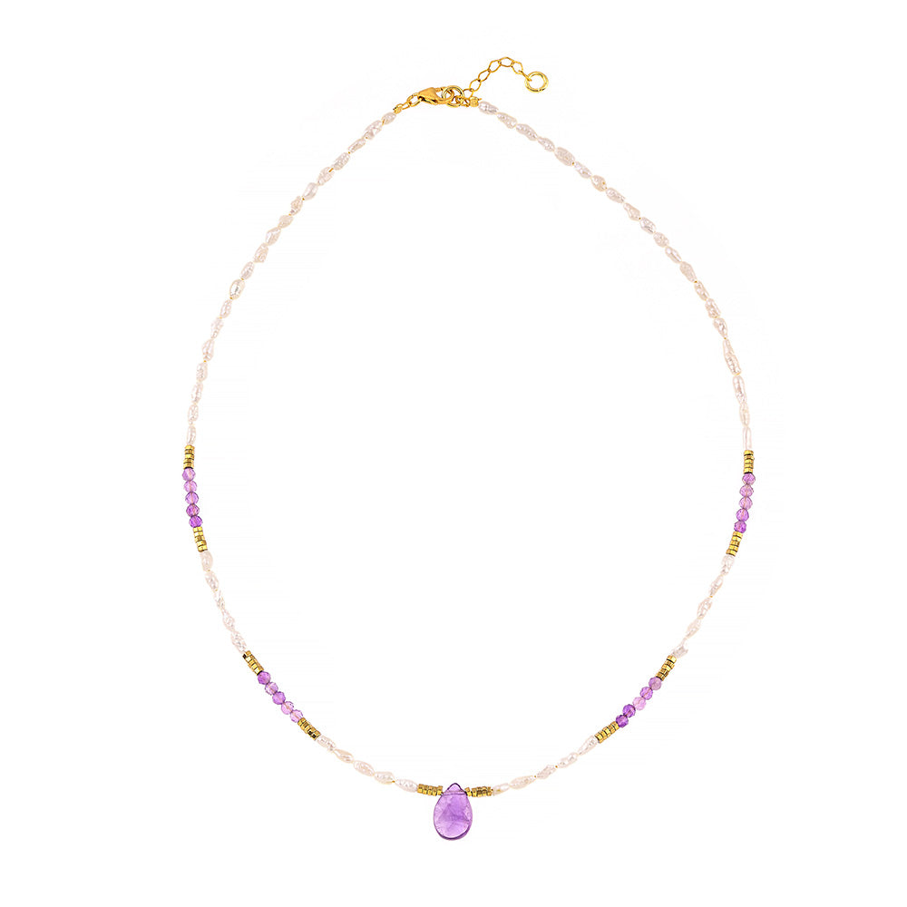 Ασημένιο κολιέ 925ο , με μαργαριτάρια του γλυκού νερού και αμέθυστο, ο οποίος φέρει ένα πανέμορφο χρώμα και αναδύει μία ζωντάνια που σαγηνεύει.