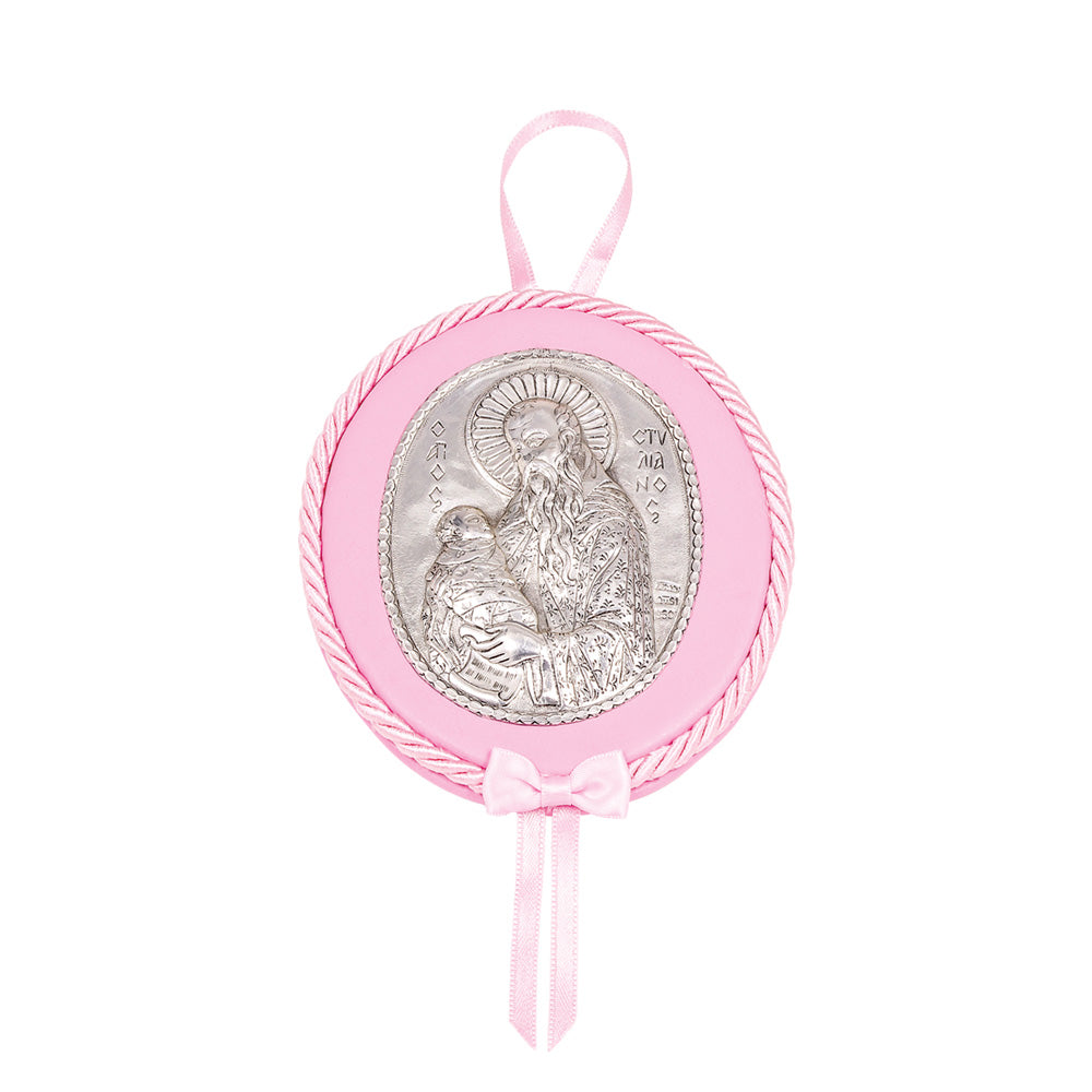 Ασημένιο παιδικό κρεμαστό φυλαχτό 925ο με τον Άγιο Στυλιανό, σε οβάλ χρωματιστό βελούδινο πλαίσιο