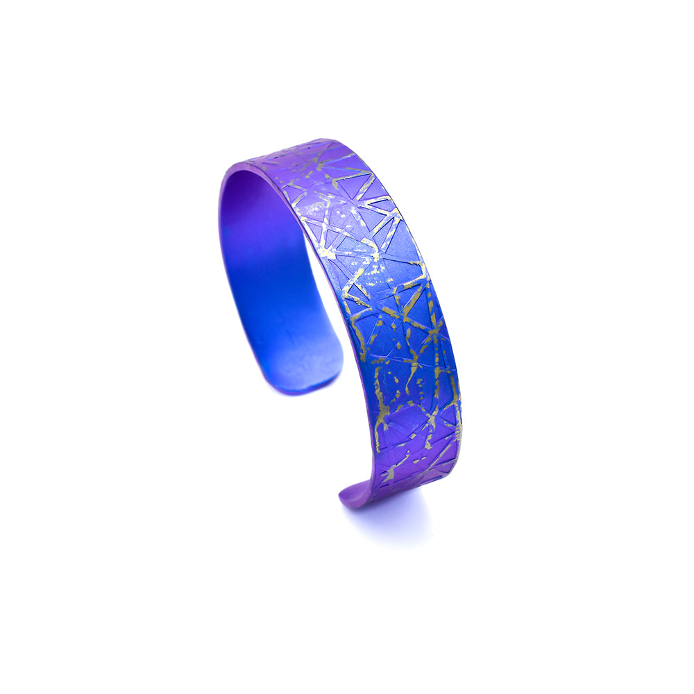 μωβ βραχιόλι από ανοδιωμένο τιτάνιο με μοναδικές ανάγλυφες και φωτεινές λεπτομέρειες που συντελούν στη δημιουργία ενός κομματιού που ξεχωρίζει σε κάθε είδους περίσταση.