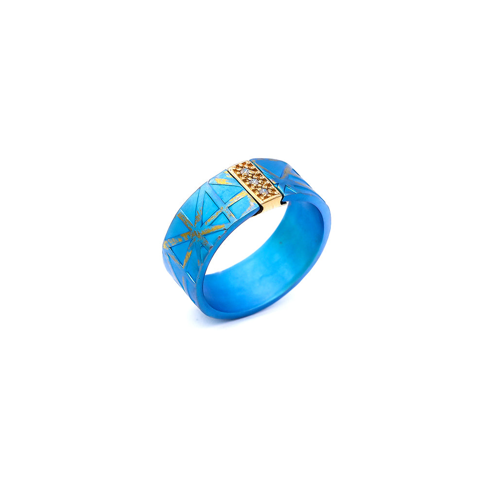 Δαχτυλίδι από ανοδιωμένο τιτάνιο με ανάγλυφες φωτεινές λεπτομέρειες και μία επιχρυσωμένη ασημένια μπάρα με 3 ζιργκόν. Εμπερικλείει κάτι από τα στοιχεία του ουρανού και της θάλασσας, για να μπορέσετε να τα φορέσετε και να συνδεθείτε μαζί τους.