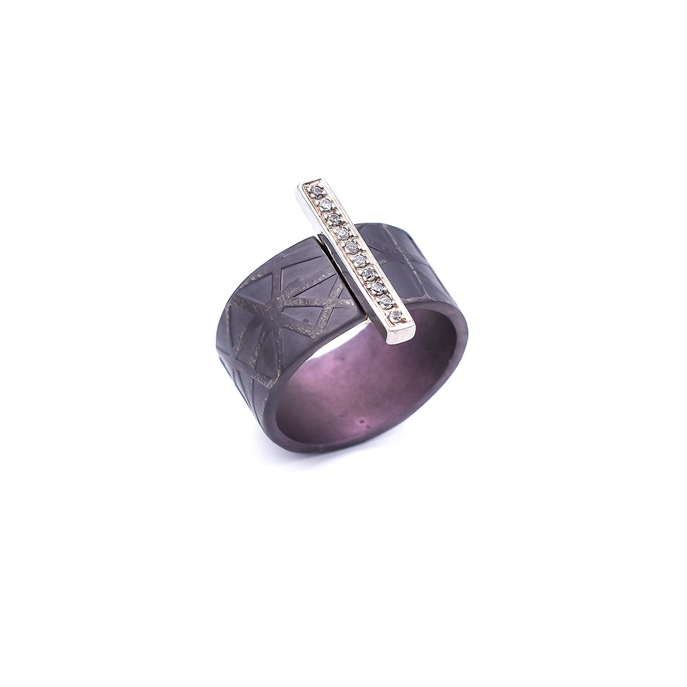 Δαχτυλίδι τιτανίου σε μοντέρνο σχέδιο με μία ασημένια μπάρα που προεξέχει του σώματός του και κοσμείται από 10 ζιργκόν. Ένα κομμάτι που χαρίζει εντυπωσιακή κομψότητα.