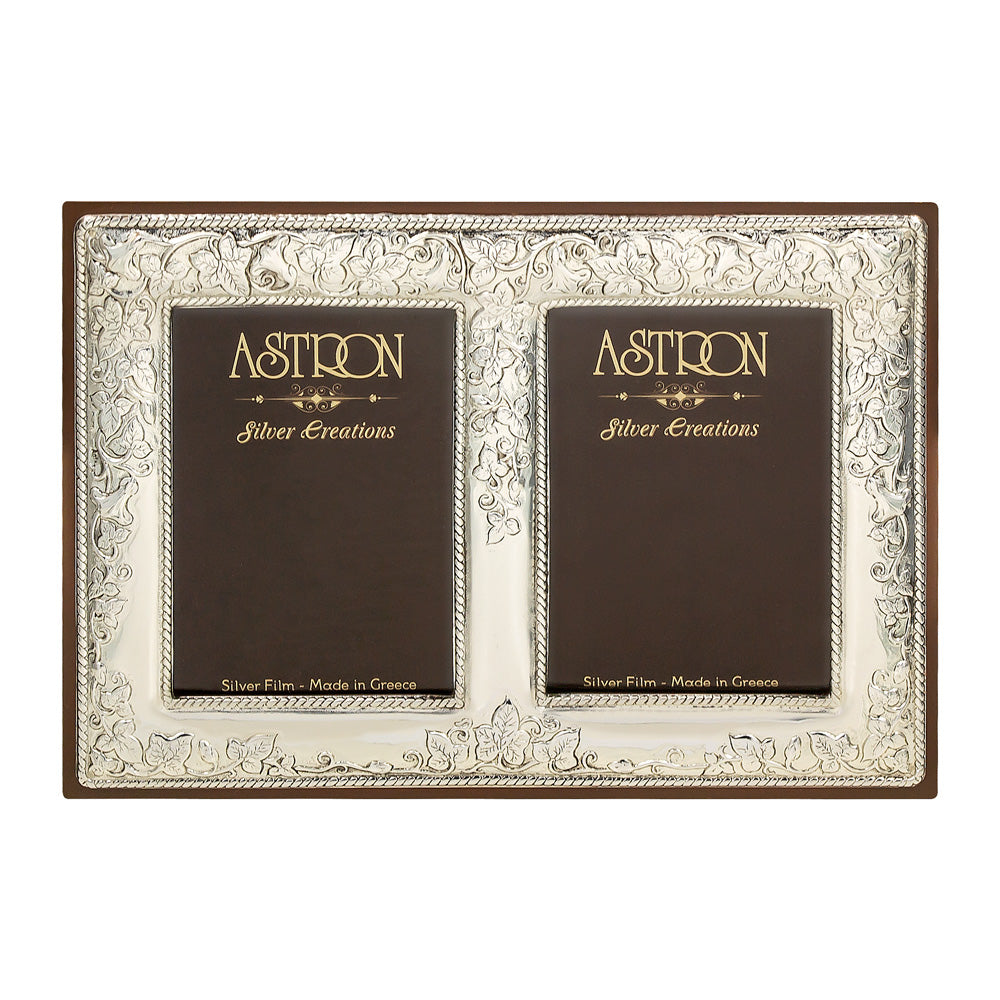 Διπλή κορνίζα σε silver film, με εντυπωσιακό σχεδιασμό και ξύλινη πλάτη.