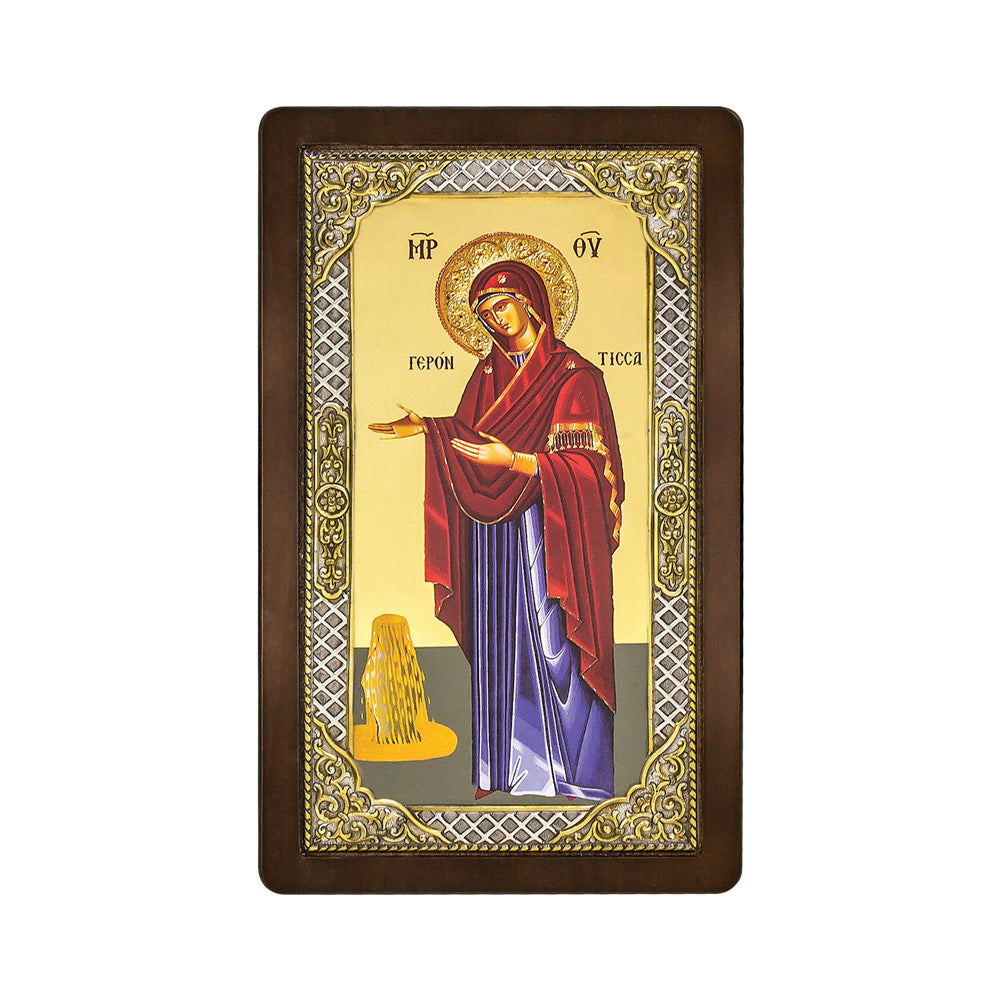Εικόνα βυζαντινής τέχνης «Παναγία η Γερόντισσα» με γνήσια μεταξοτυπία σε καμβά με φύλλα χρυσού, στηριγμένη σε όμορφη ξύλινη πλάτη. Το σκαλιστό πλαίσιο αποτελείται από καθαρό ασήμι 925ο και έχει υποστεί επιχρυσώματα Κ24 στις λεπτομέρειες, ενώ είναι καλυμμένο από ηλεκτροστατικό βερνίκι για έξτρα προστασία.
