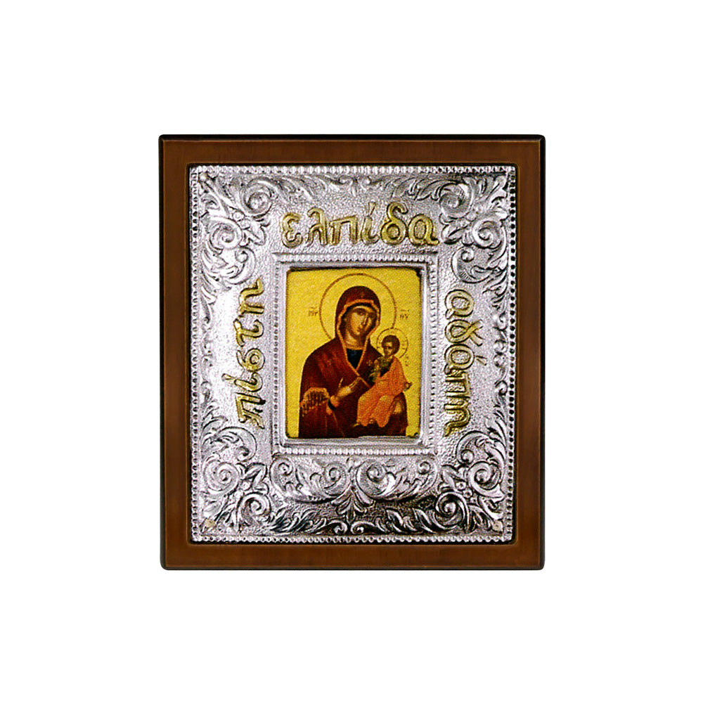 Εικόνα γνήσιας μεταξοτυπίας «Παναγιά Αμόλυντος» σε καμβά, ασημένιο πλαίσιο 925ο και επιχρυσώματα 24Κ στα γράμματα.
