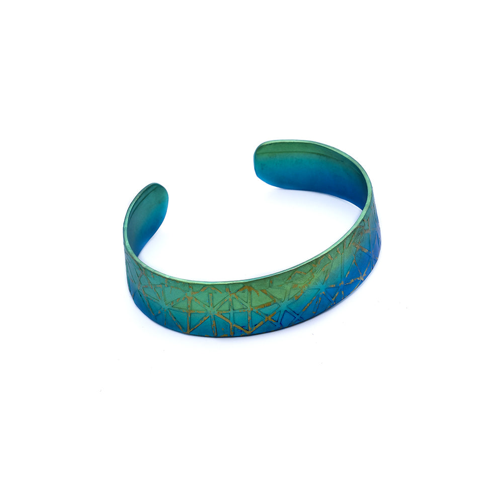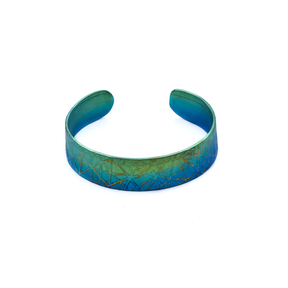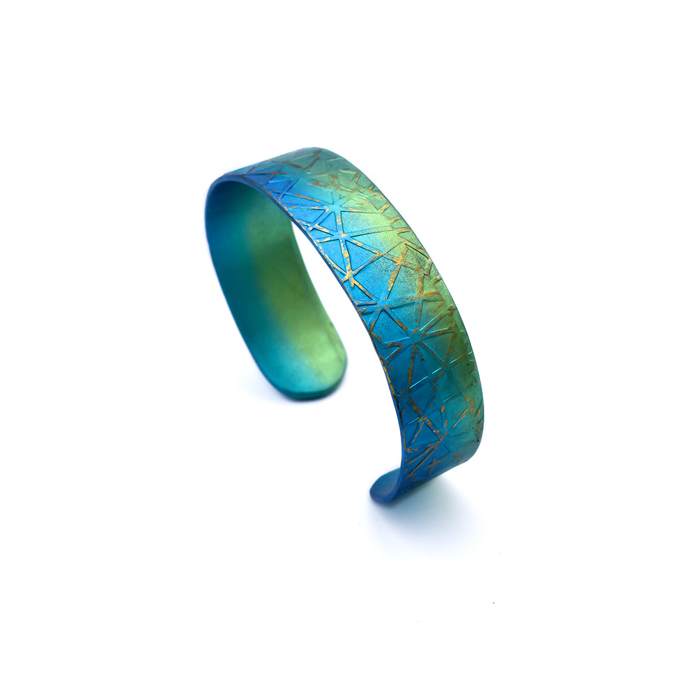 Ιριδίζον βραχιόλι από ανοδιωμένο τιτάνιο, με επιφάνεια που παίζει με την εναλλαγή των χρωμάτων και του φωτός, σαγηνεύοντας και μαγνητίζοντας τον παρατηρητή.