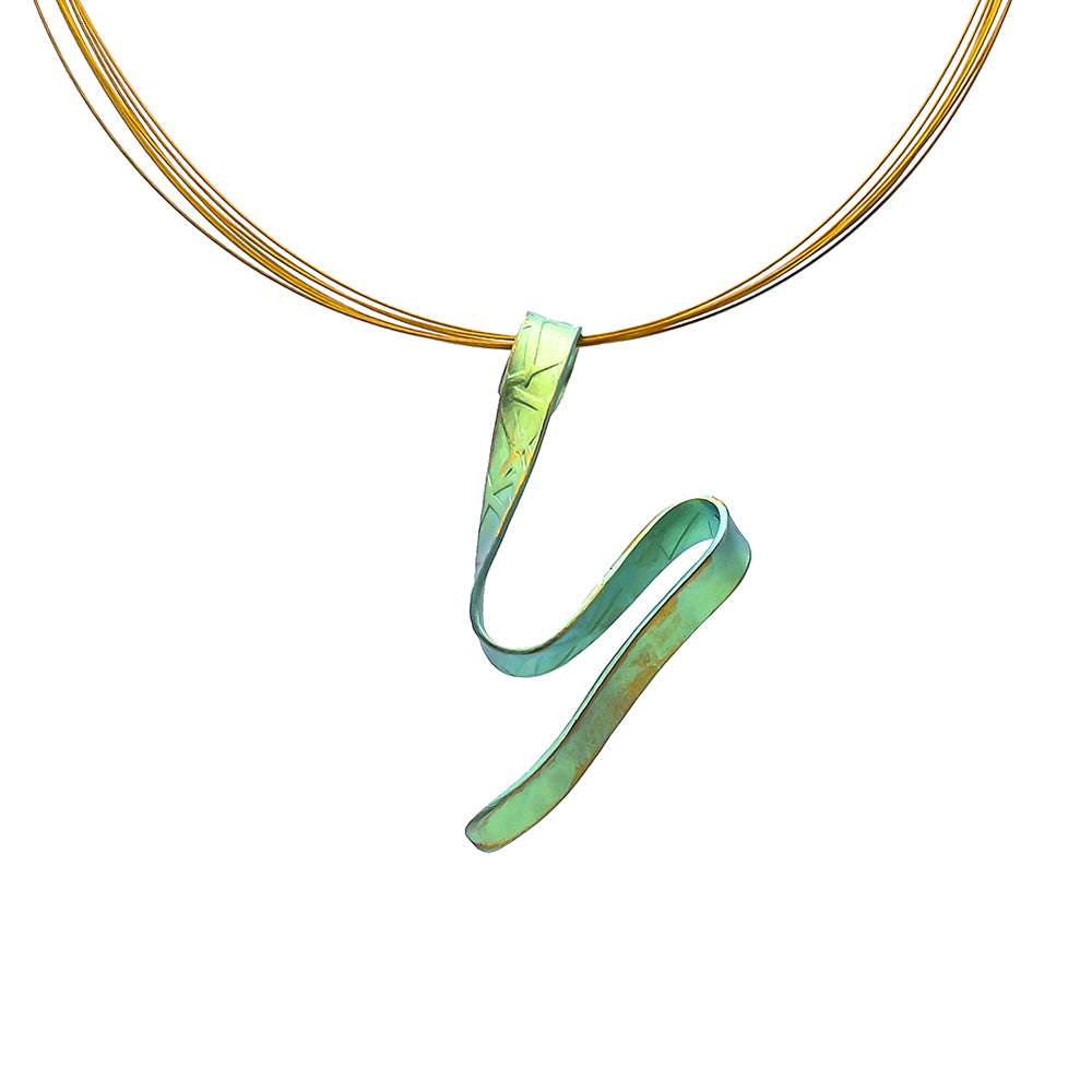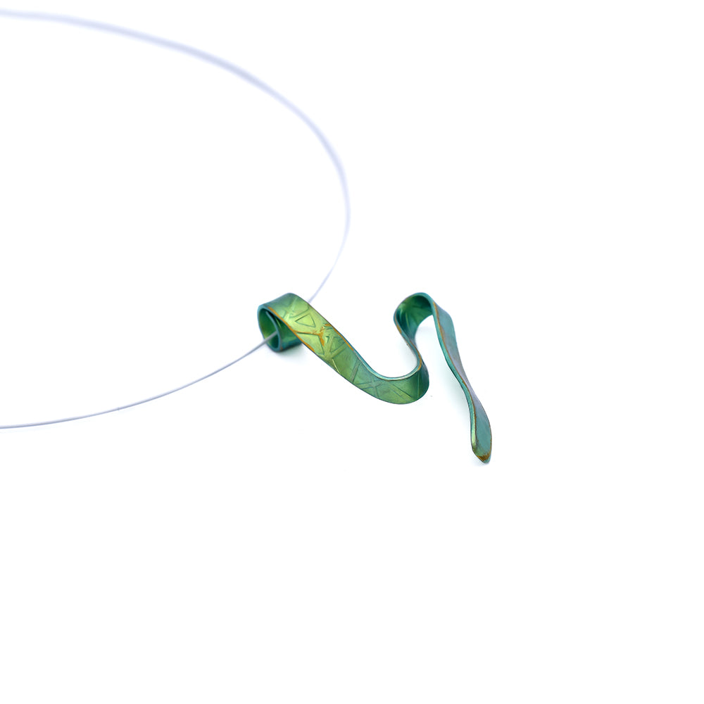 Κολιέ με πράσινη ιριδίζουσα κορδέλα ανοδιωμένου τιτανίου, που παραπέμπει σε στιγμιότυπο χορευτικής κίνησης και σας ωθεί να ανακαλύψετε τους ρυθμούς της ζωής, και ποιος ξέρει… ίσως και να χορέψετε σε αυτούς!