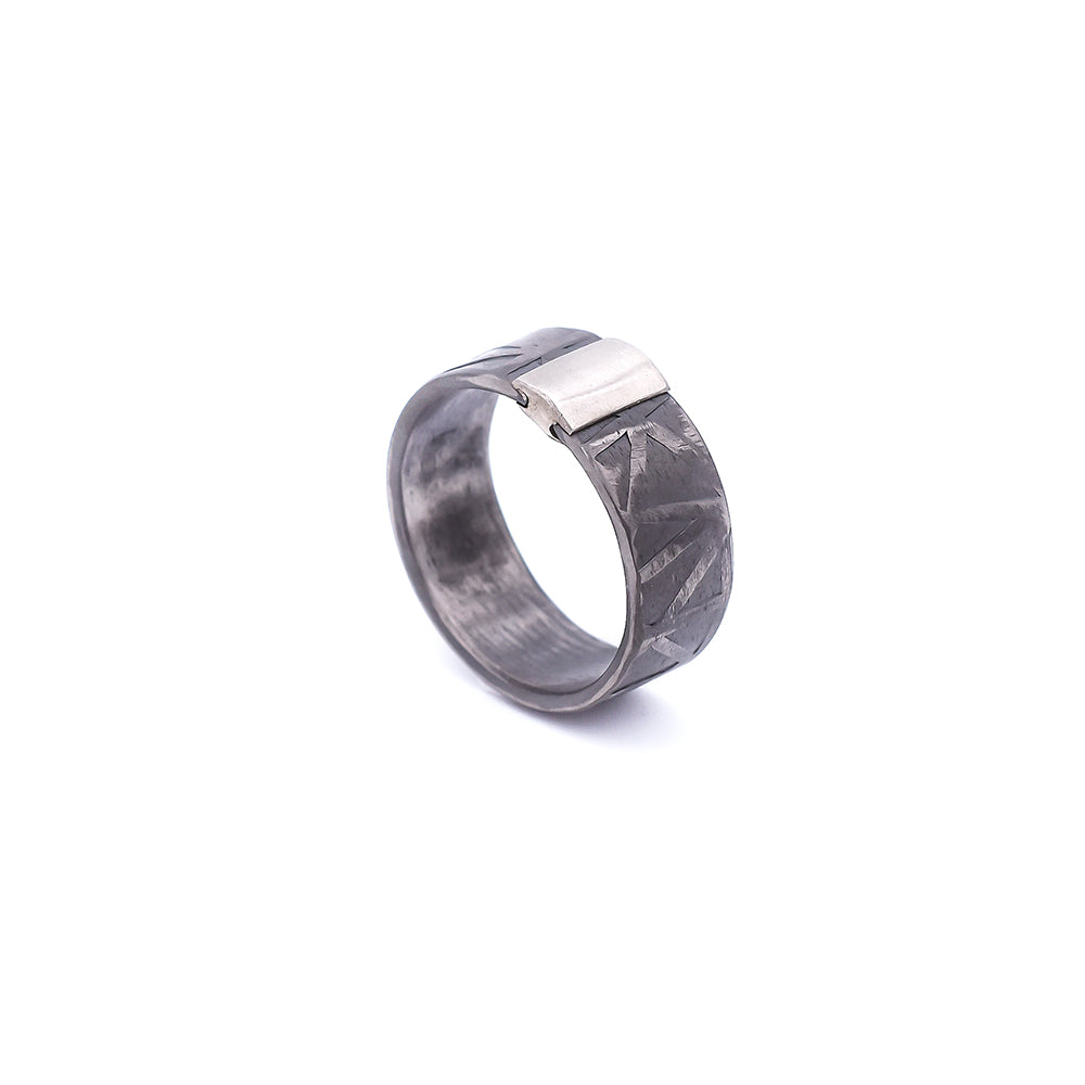 Δαχτυλίδι από ανοδιωμένο τιτάνιο με ανάγλυφες λεπτομέρειες και μία ασημένια λεία μπάρα που δένει άψογα με το γκρι χρωματισμό του δίνοντας ένα κομψό αποτέλεσμα.
