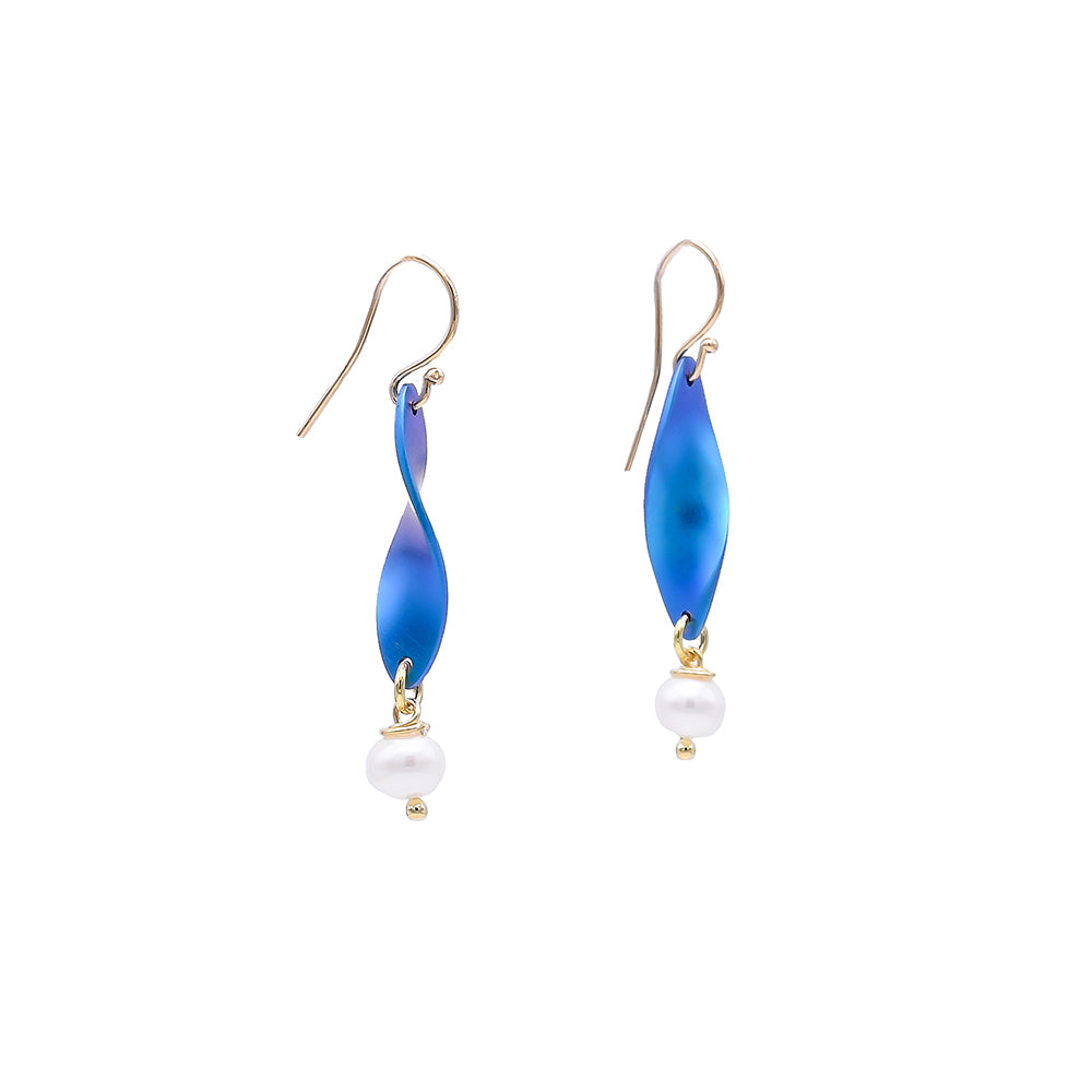 Κρεμαστά σκουλαρίκια από μπλέ τιτάνιο, που ενσαρκώνουν το στοιχείο του νερού και αναπαύονται με φινέτσα καθώς κοσμούνται από δύο υπέροχα μαργαριτάρια.