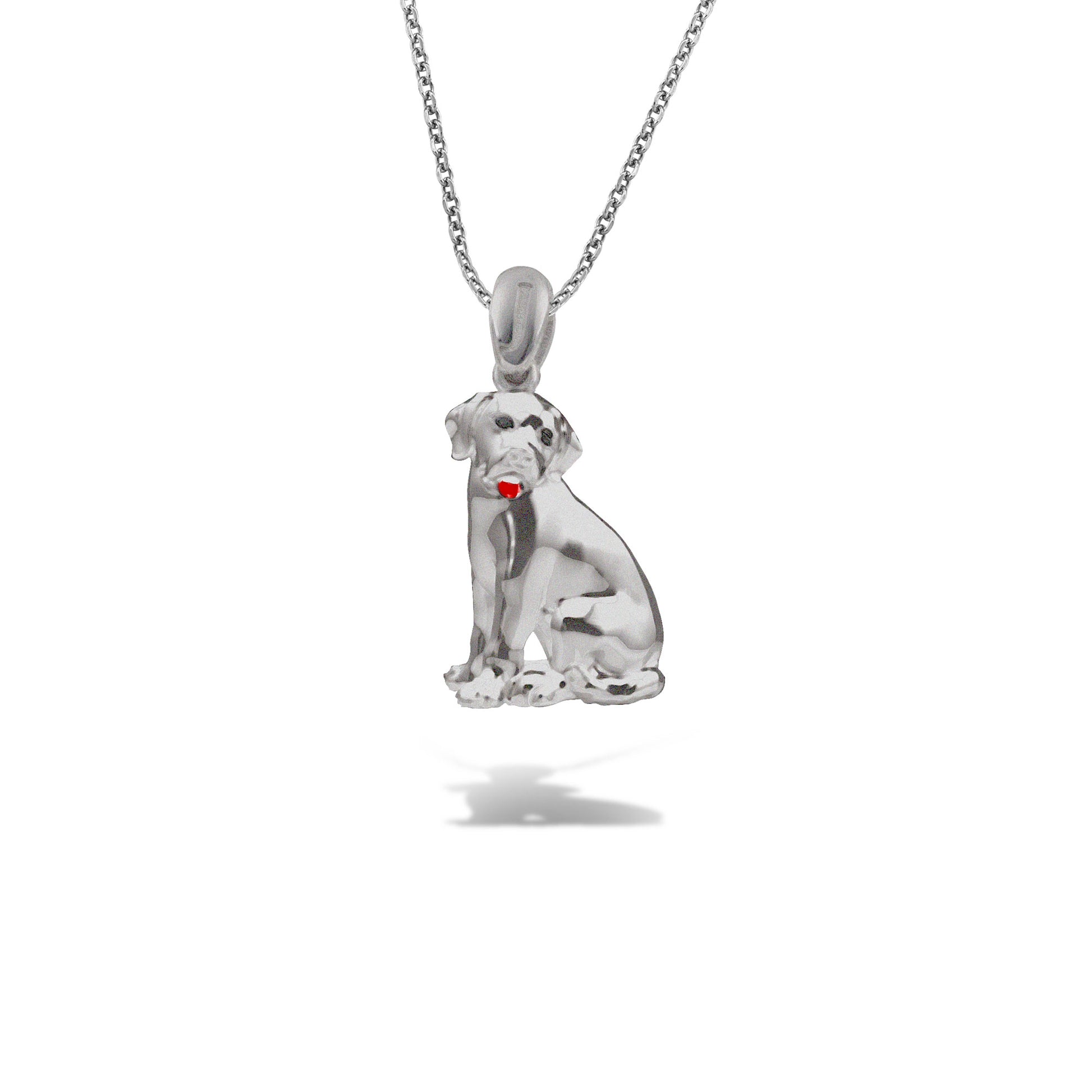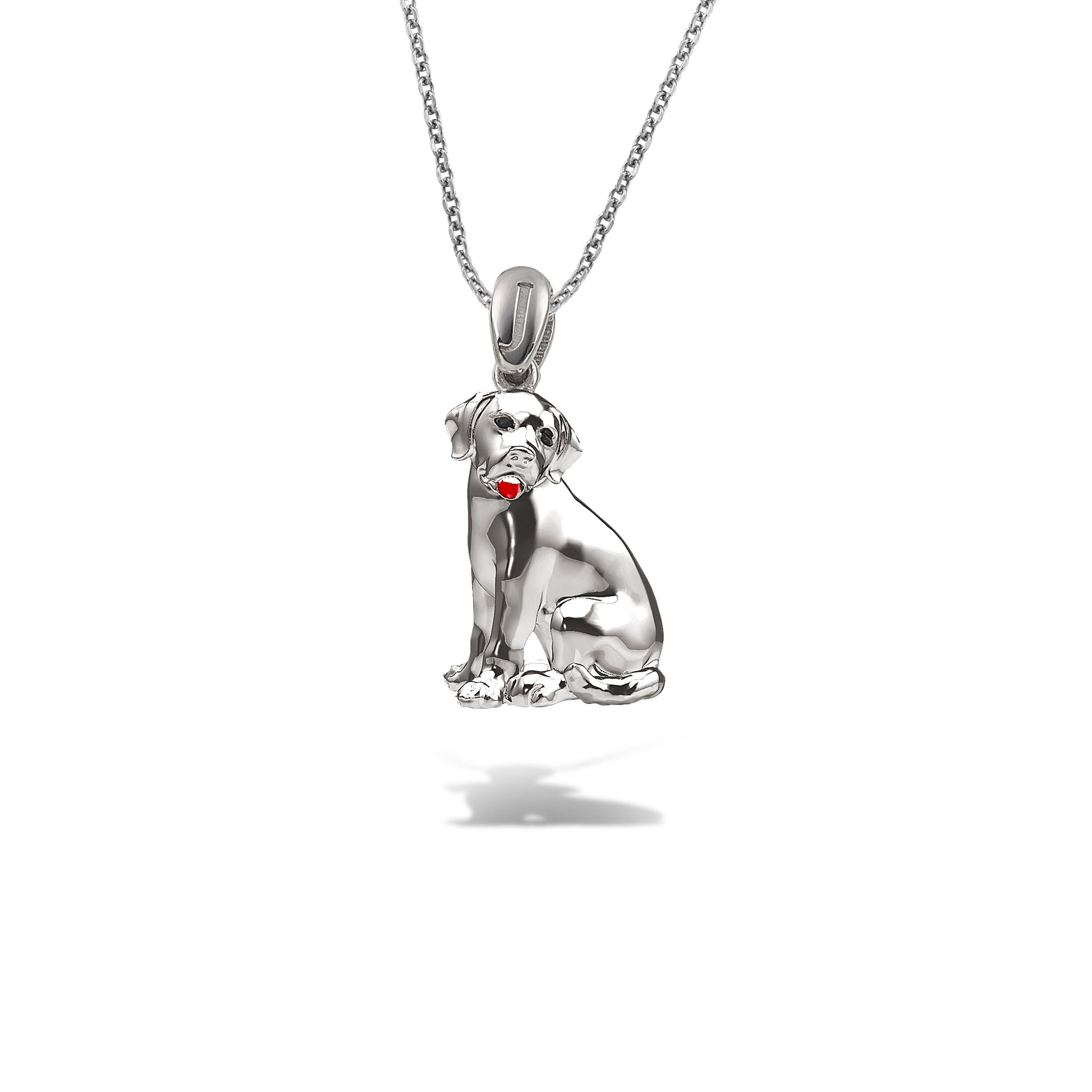 Λευκόχρυσο μενταγιόν Κ18, σε σχήμα αξιολάτρευτου κουταβιού με μαύρα διαμάντια και σμάλτο που χαρίζουν λάμψη και χρώμα στο ζωντανό του σχέδιο.