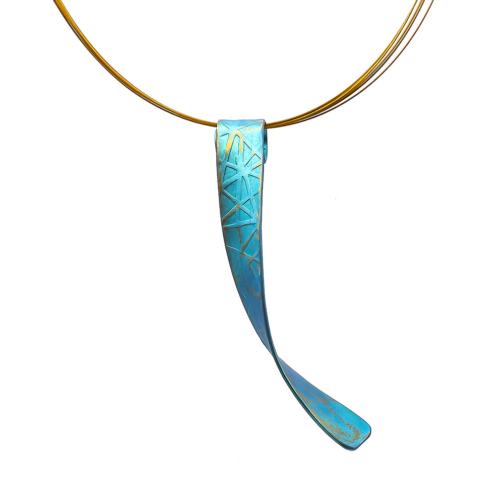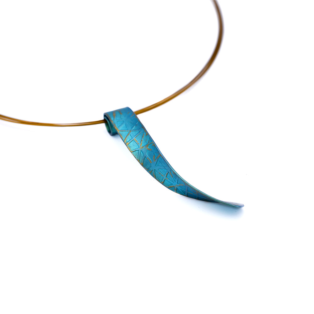 Κολιέ με ανοδιωμένη κορδέλα τιτανίου που κυματίζει και στηρίζεται με χάρη στο πάνω μέρος του στήθους.
