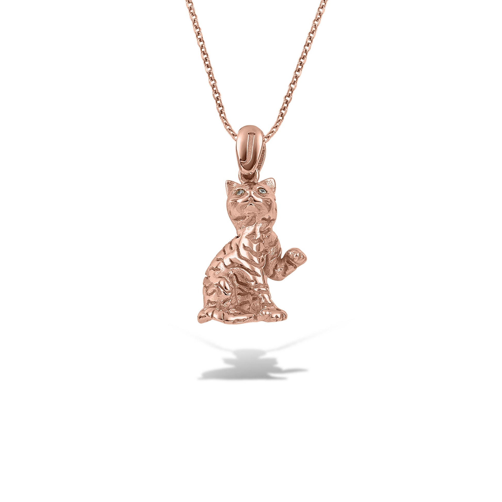 Χρυσό μενταγιόν Κ18, σε σχήμα παιχνιδιάρικης γάτας με ανάγλυφη επιφάνεια, η οποία κοσμείται από λευκά διαμάντια και χρωματίζεται με σμάλτο, παίρνοντας πνοή στο λαιμό σας!