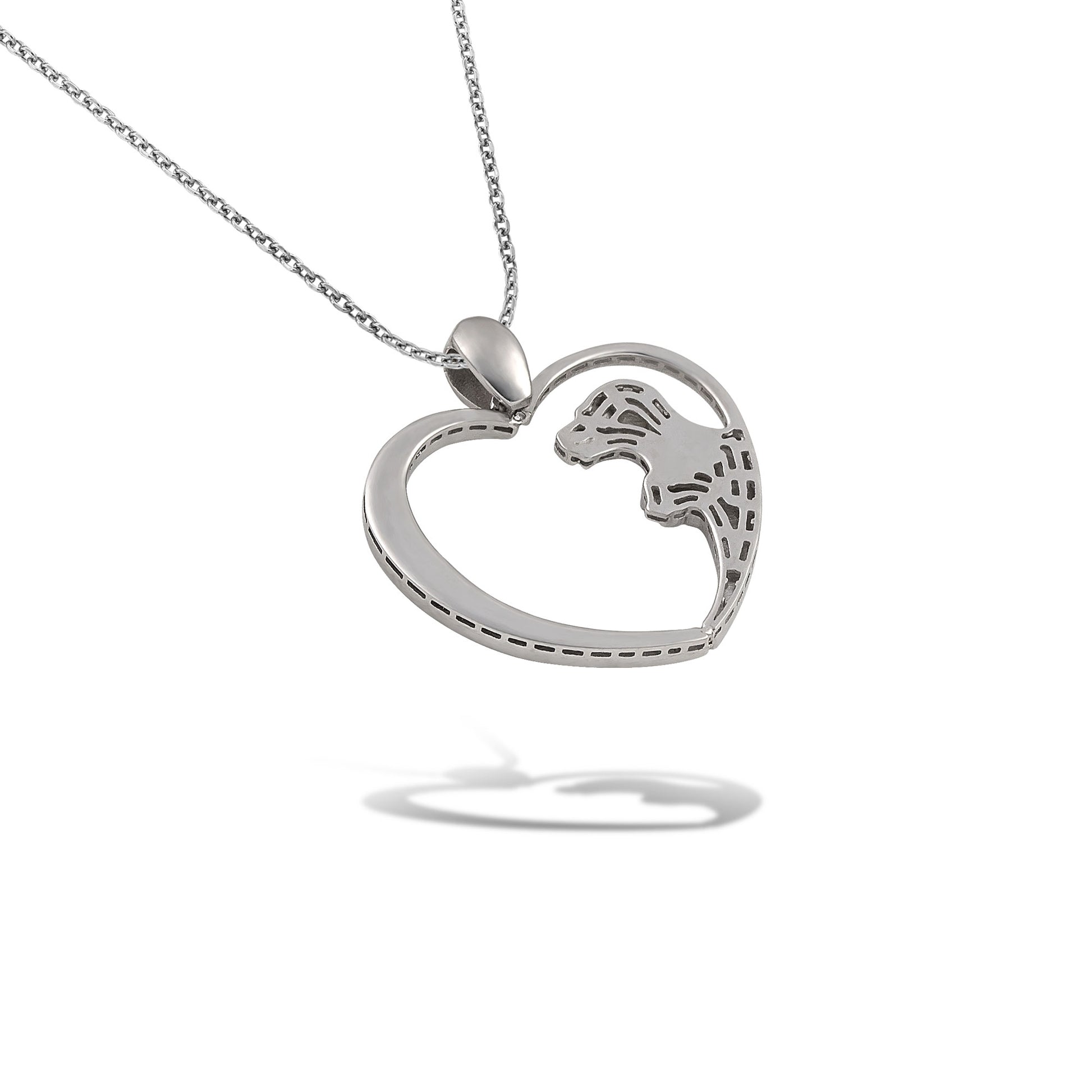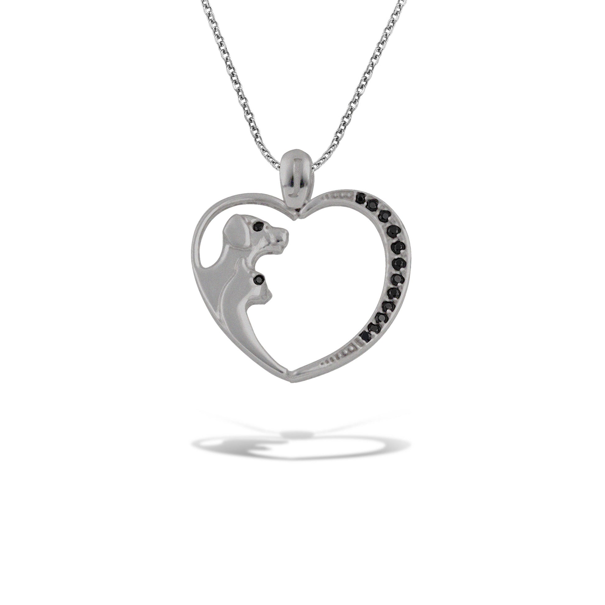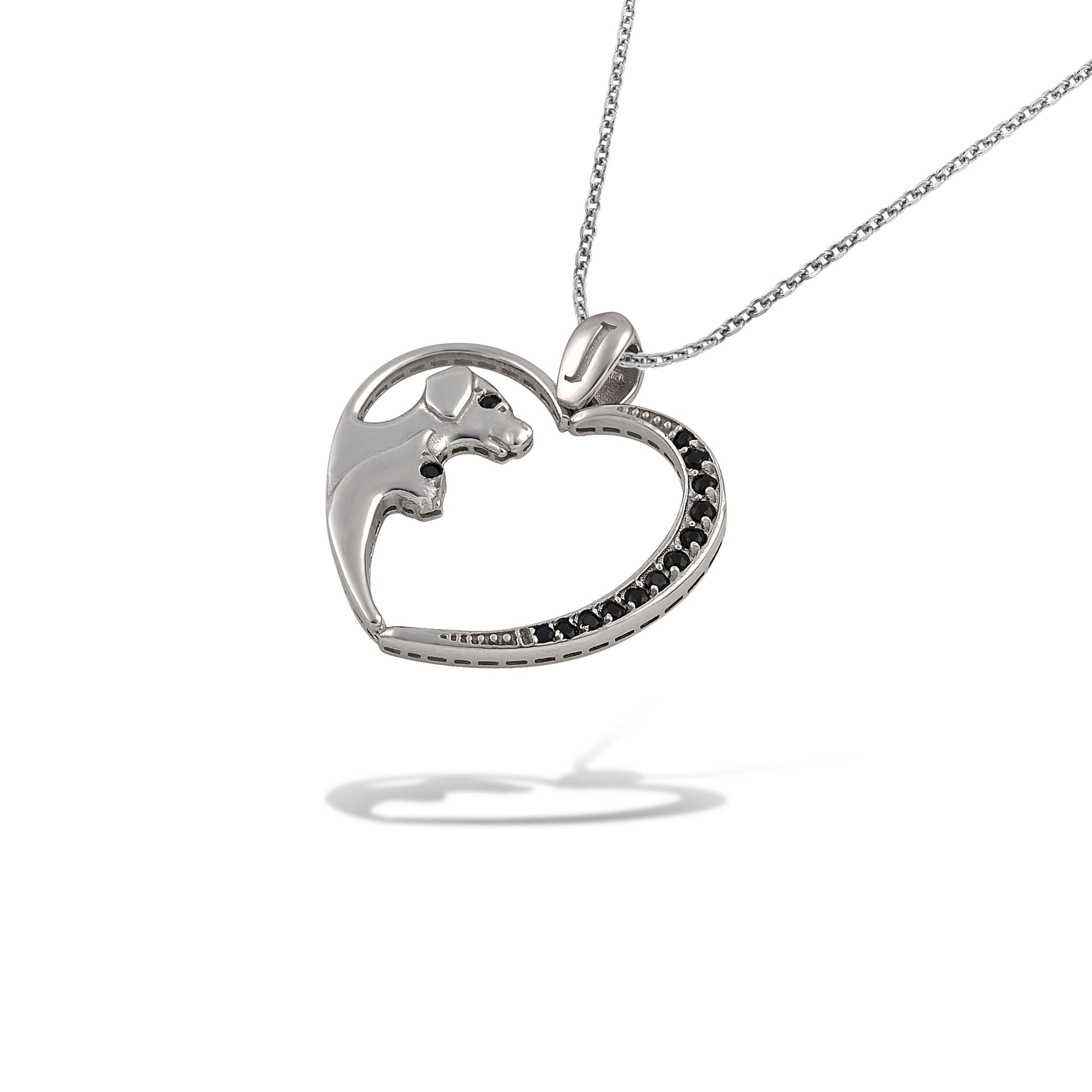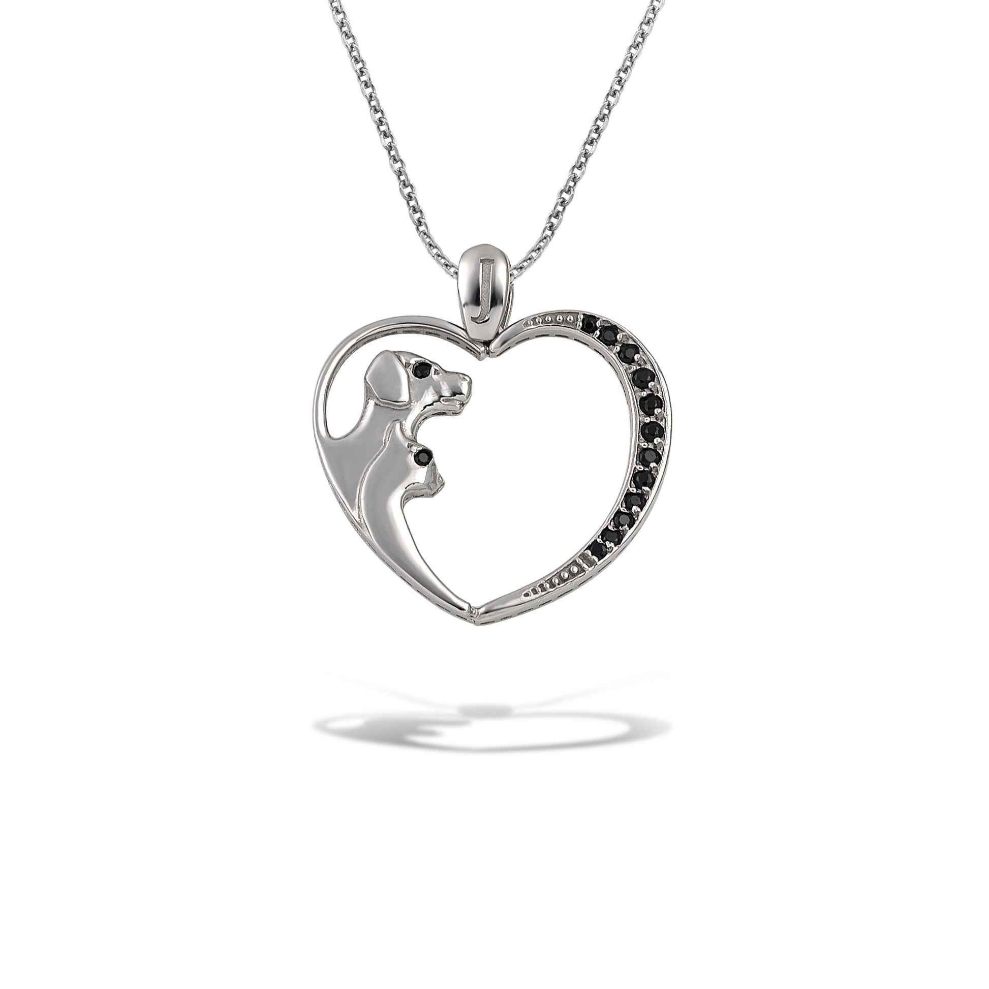 Λευκόχρυσο μενταγιόν Κ18 σε σχήμα περίτεχνης καρδιάς που εμπερικλείει μία γάτα κι ένα σκύλο και κοσμείται από πανέμορφα μαύρα διαμάντια. Σύμβολο αγάπης, αφοσίωσης, και μνήμης, είναι ένας φόρος τιμής στα αγαπημένα σας κατοικίδια.
