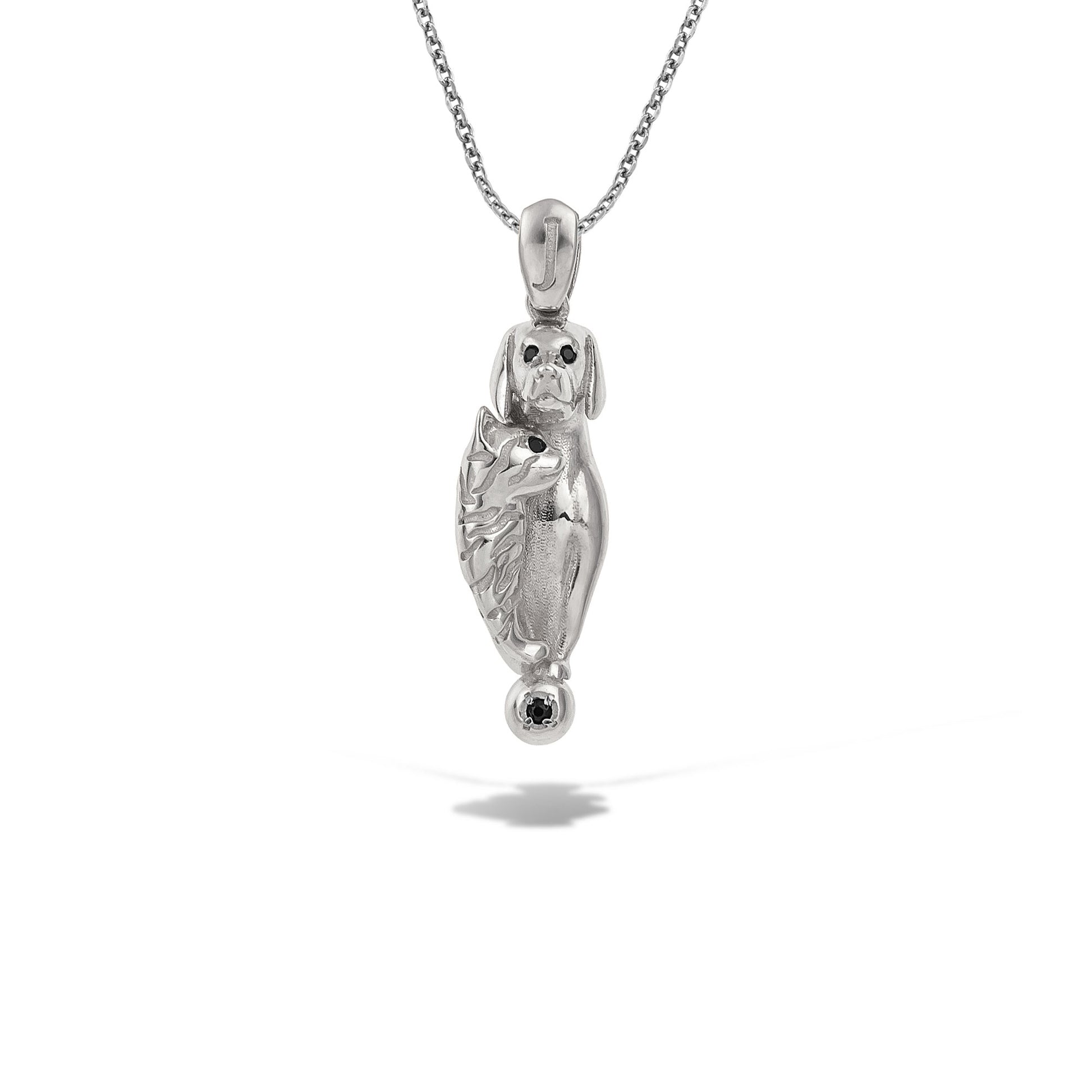 Λευκόχρυσο μενταγιόν Κ18 με μαύρα διαμάντια σε όμορφο ανάγλυφο σχέδιο γάτας μαζί με σκύλο, σαν ένα σύγχρονο yin – yang που φέρει αρμονία και αγάπη.