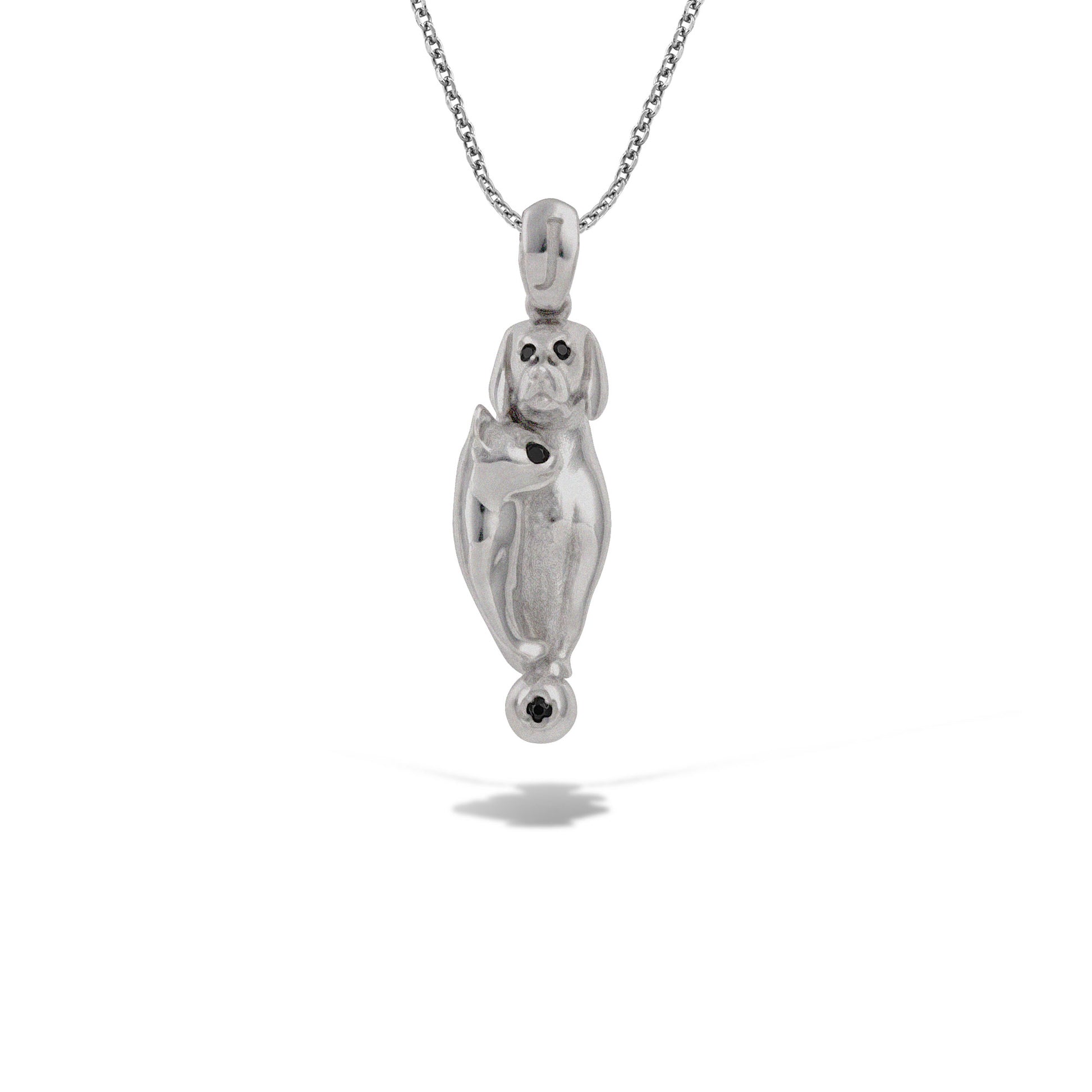 Λευκόχρυσο μενταγιόν Κ18 με μαύρα διαμάντια σε όμορφο λείο σχέδιο γάτας μαζί με σκύλο, σαν ένα σύγχρονο yin – yang που φέρει αρμονία και αγάπη.