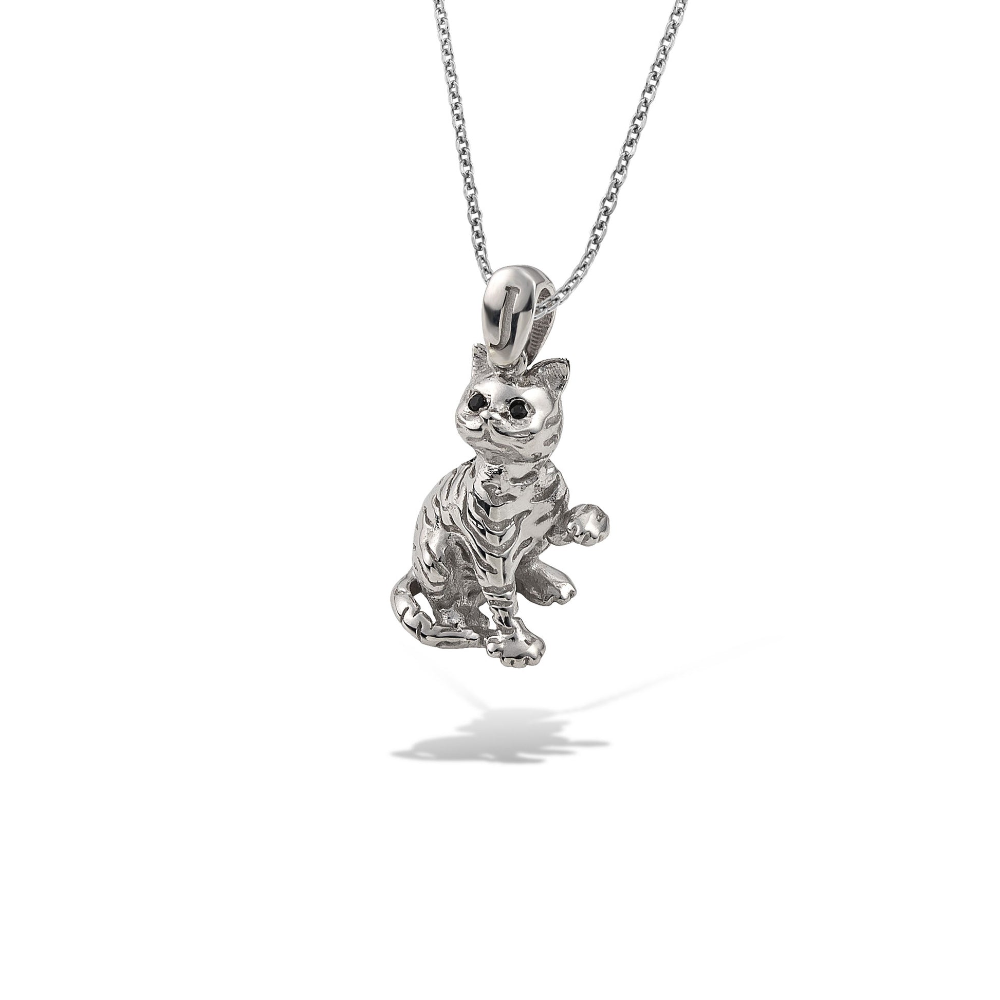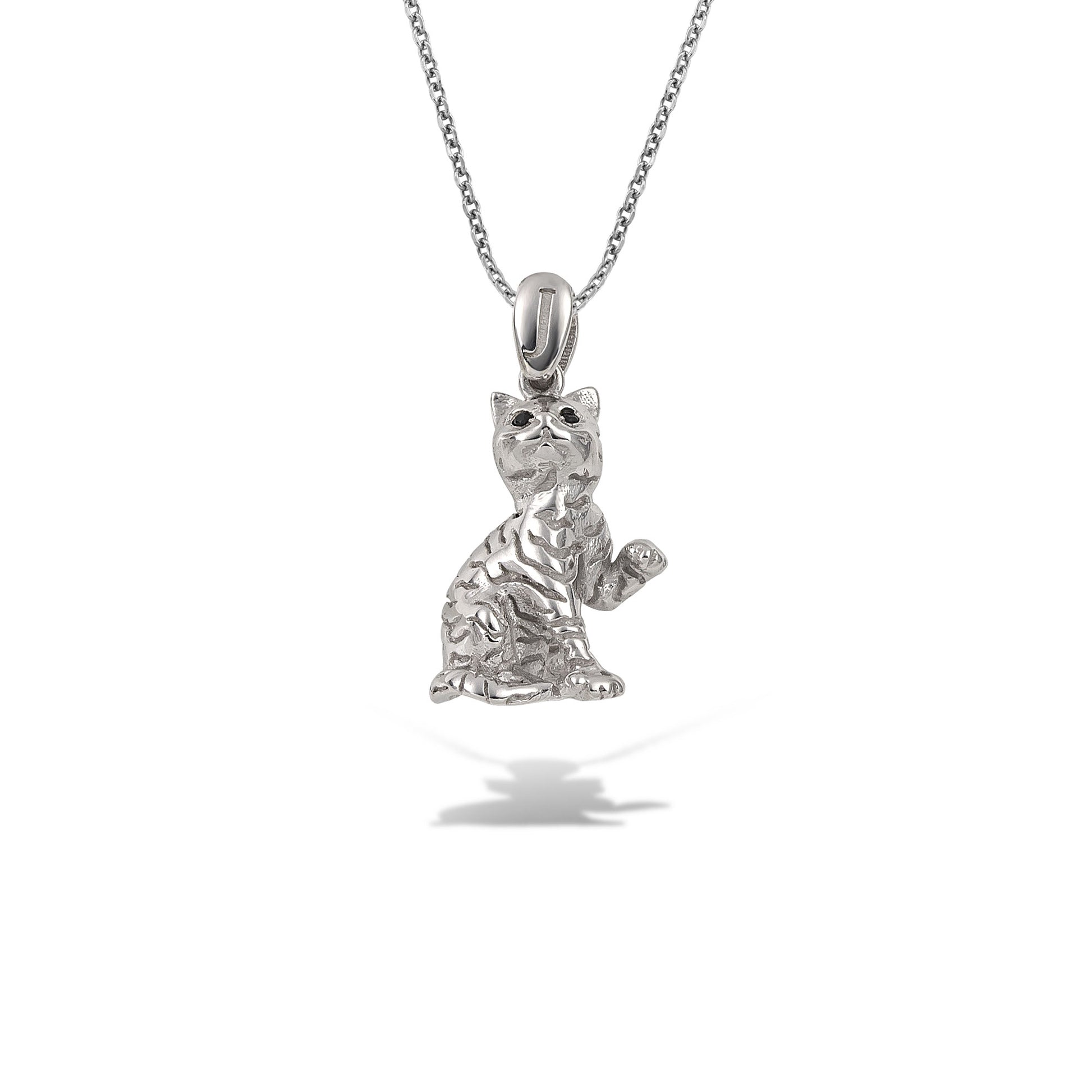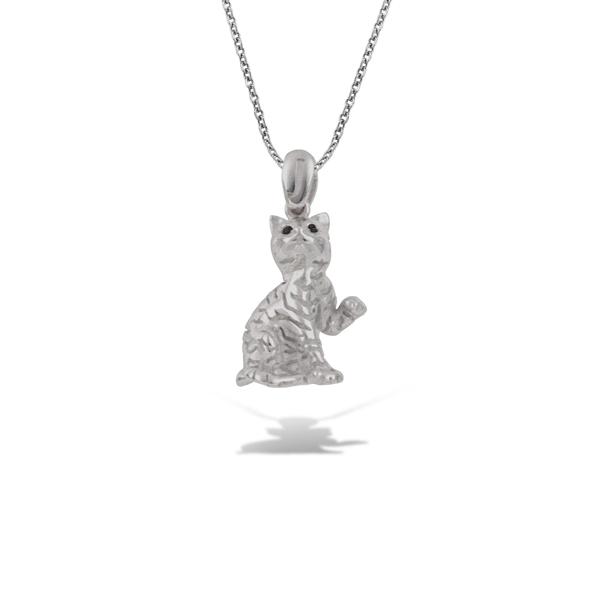 Λευκόχρυσο μενταγιόν Κ18, σε σχήμα παιχνιδιάρικης γάτας με ανάγλυφη επιφάνεια, η οποία κοσμείται από μαύρα διαμάντια και χρωματίζεται με σμάλτο, παίρνοντας πνοή στο λαιμό σας!