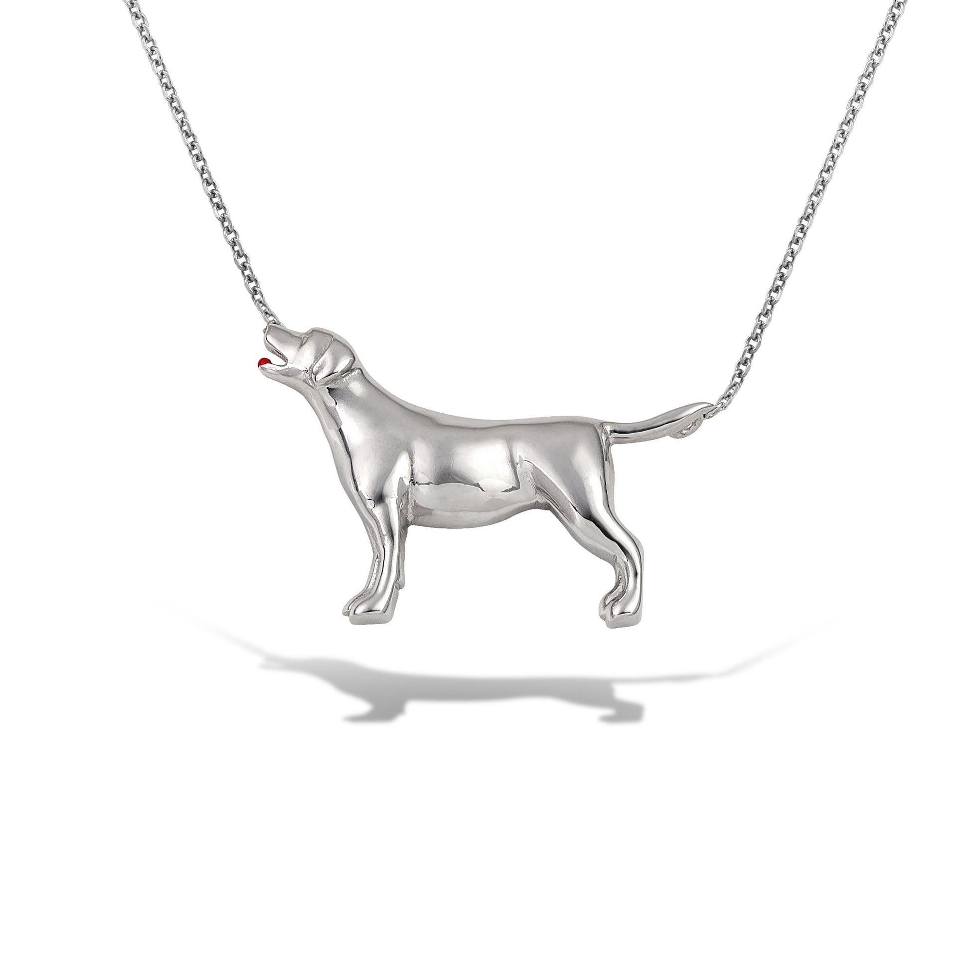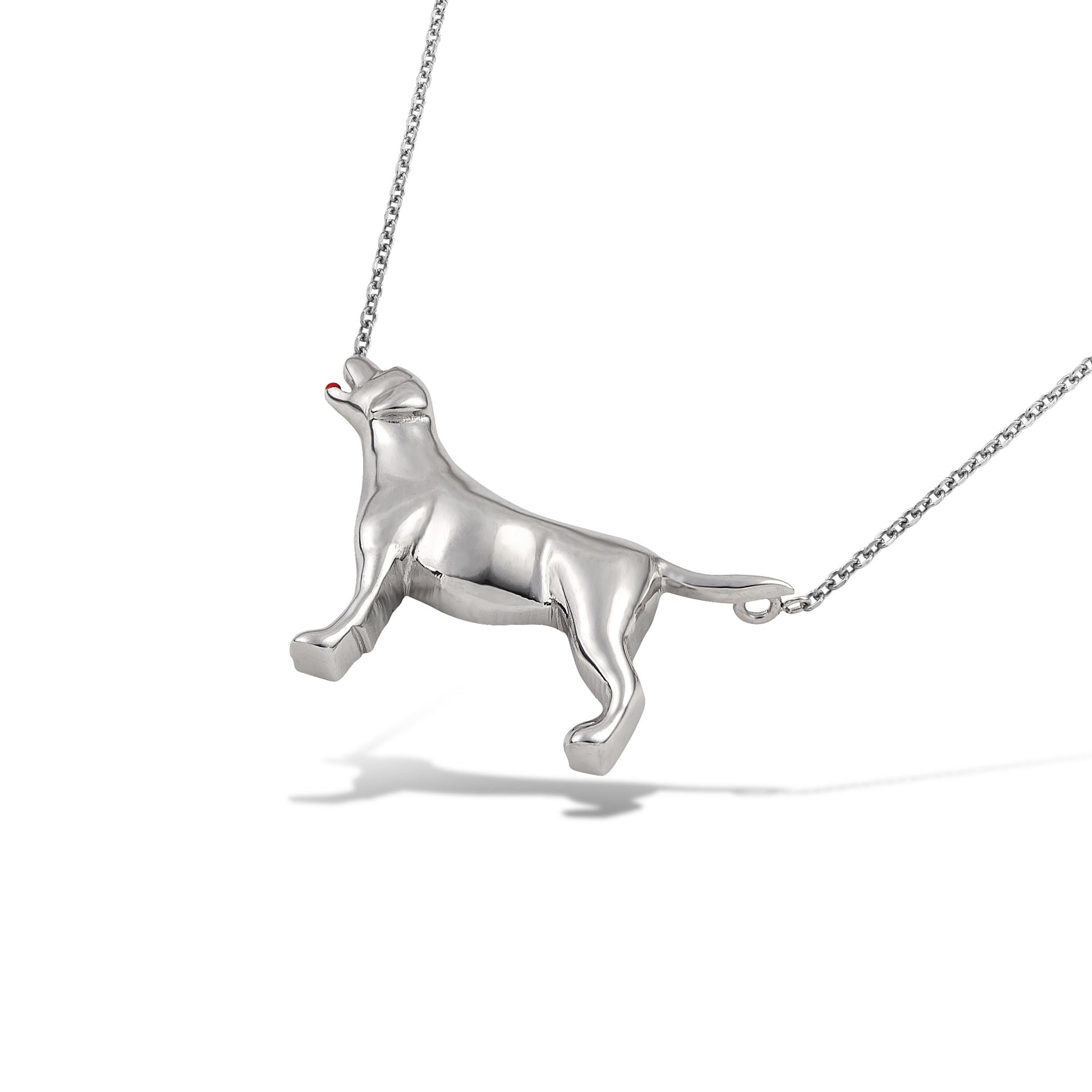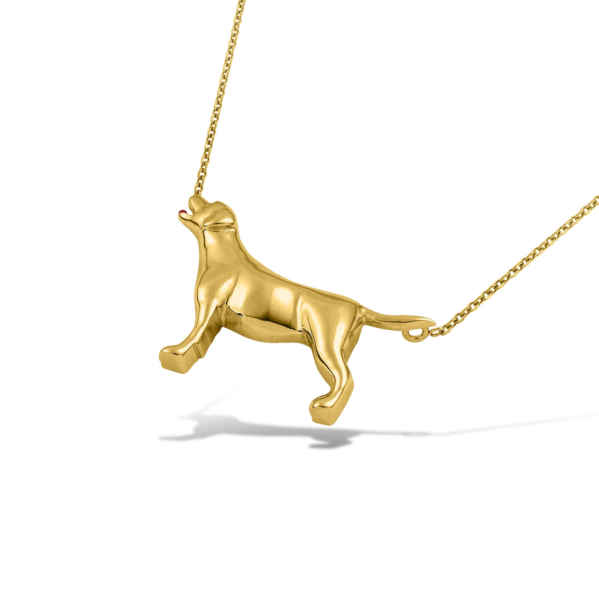 Χρυσό μενταγιόν Κ18 με σμάλτο σε σχήμα όρθιου σκύλου, που δένει άψογα με την κίνηση της αλυσίδας και αγκαλιάζει τη λαιμόκοψη, συμβολίζοντας τη ζεστασιά της αγκαλιάς των αγαπημένων σας κατοικιδίων.