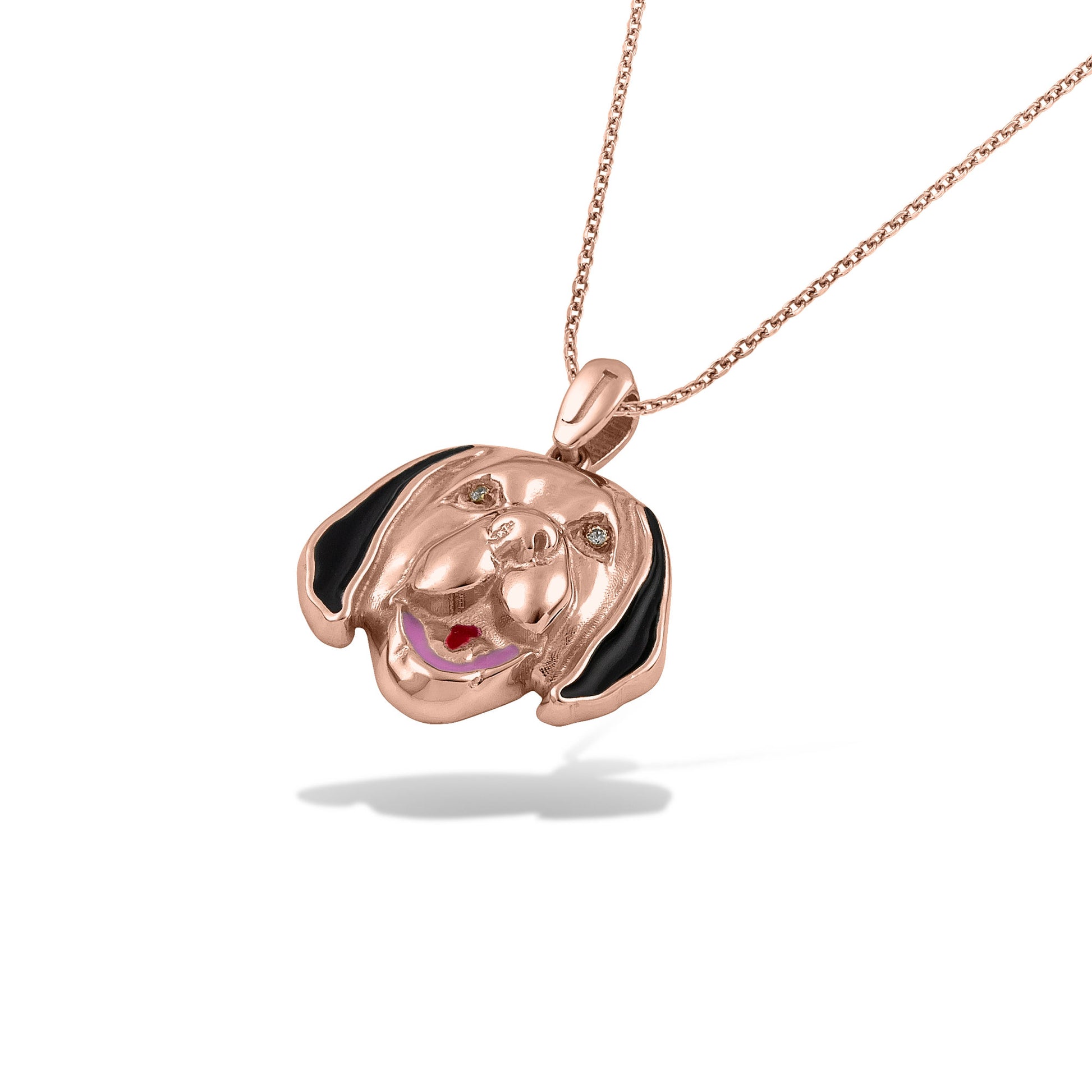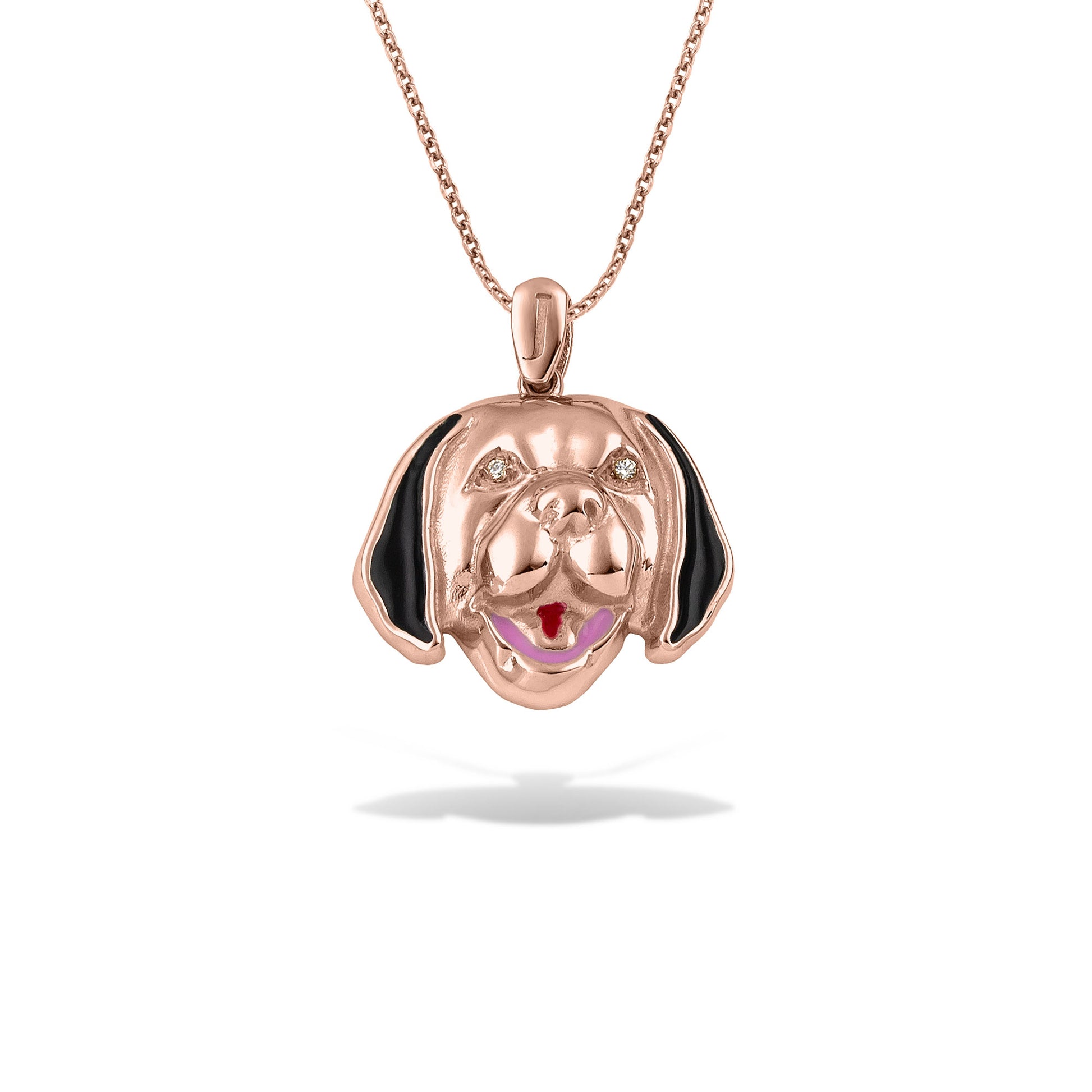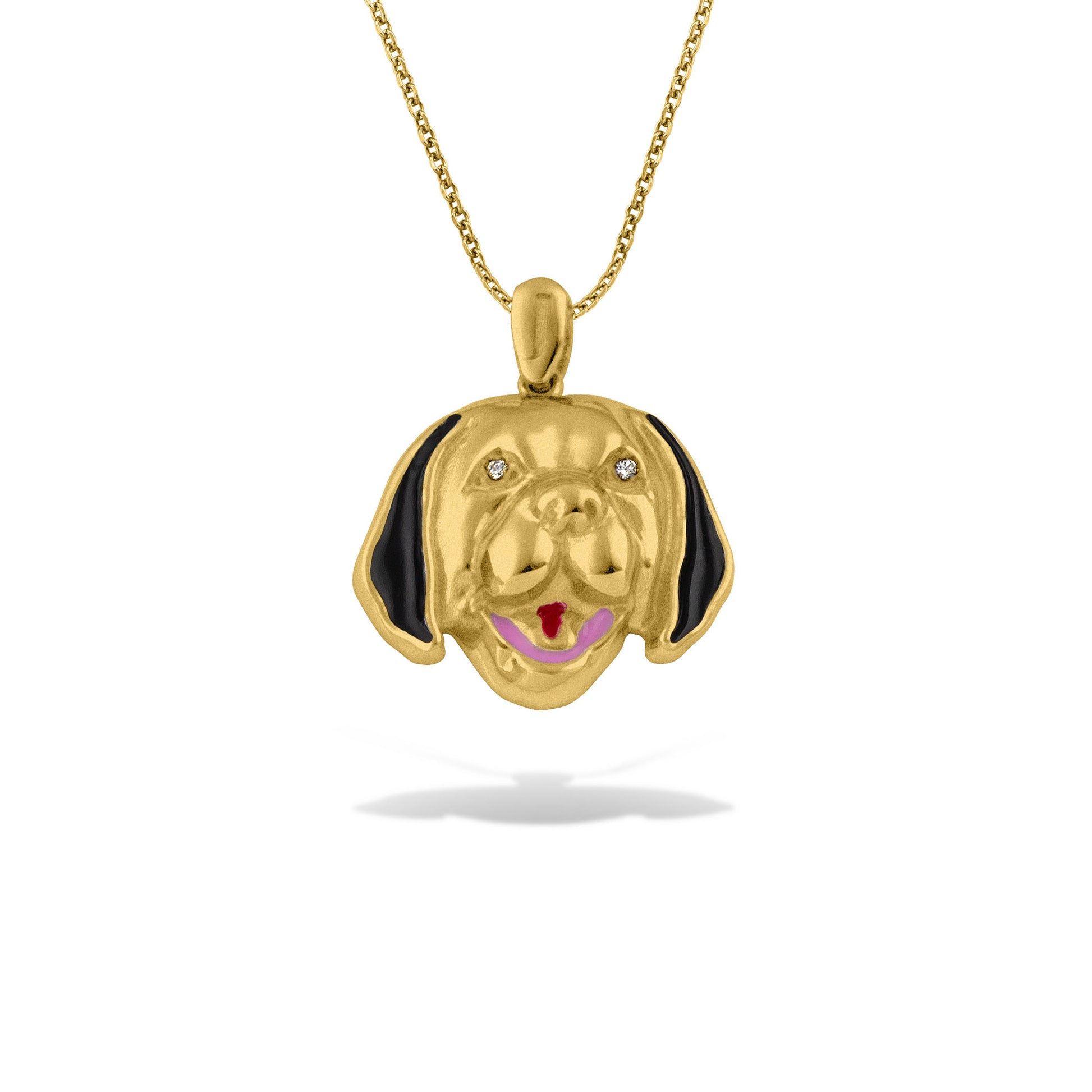 Χρυσό μενταγιόν Κ18 σε σχήμα γελαστού σκύλου, που με ζωηράδα σας γνέφει να τον γνωρίσετε! Με λευκά διαμάντια και σμάλτο, το σχέδιο εκπέμπει λάμψη και ζωή.
