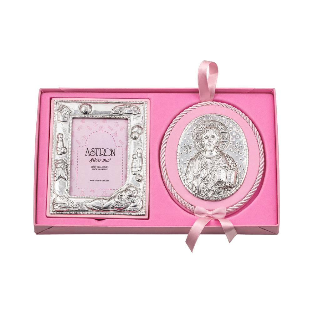Σετάκι από παιδικό ασημένιο κρεμαστό και ασημένια κορνίζα 925ο με αξιολάτρευτα σχέδια, σε πανέμορφη βελούδινη θήκη.