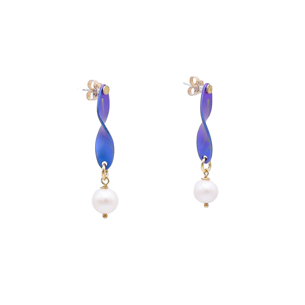 Κρεμαστά σκουλαρίκια από ανοδιωμένο τιτάνιο, που ενσαρκώνουν το στοιχείο του νερού και αναπαύονται με φινέτσα καθώς κοσμούνται από δύο υπέροχα μαργαριτάρια.