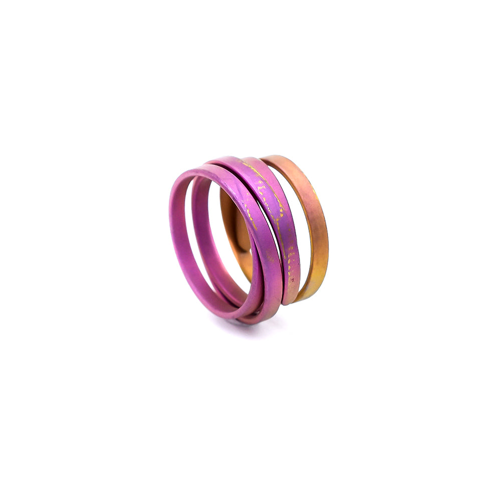 Πολύχρωμο δαχτυλίδι από ανοδιωμένο τιτάνιο σε μοντέρνο ελικοειδές σχέδιο που αναζωπυρώνει μία παιδικότητα και μία ζωντάνια.