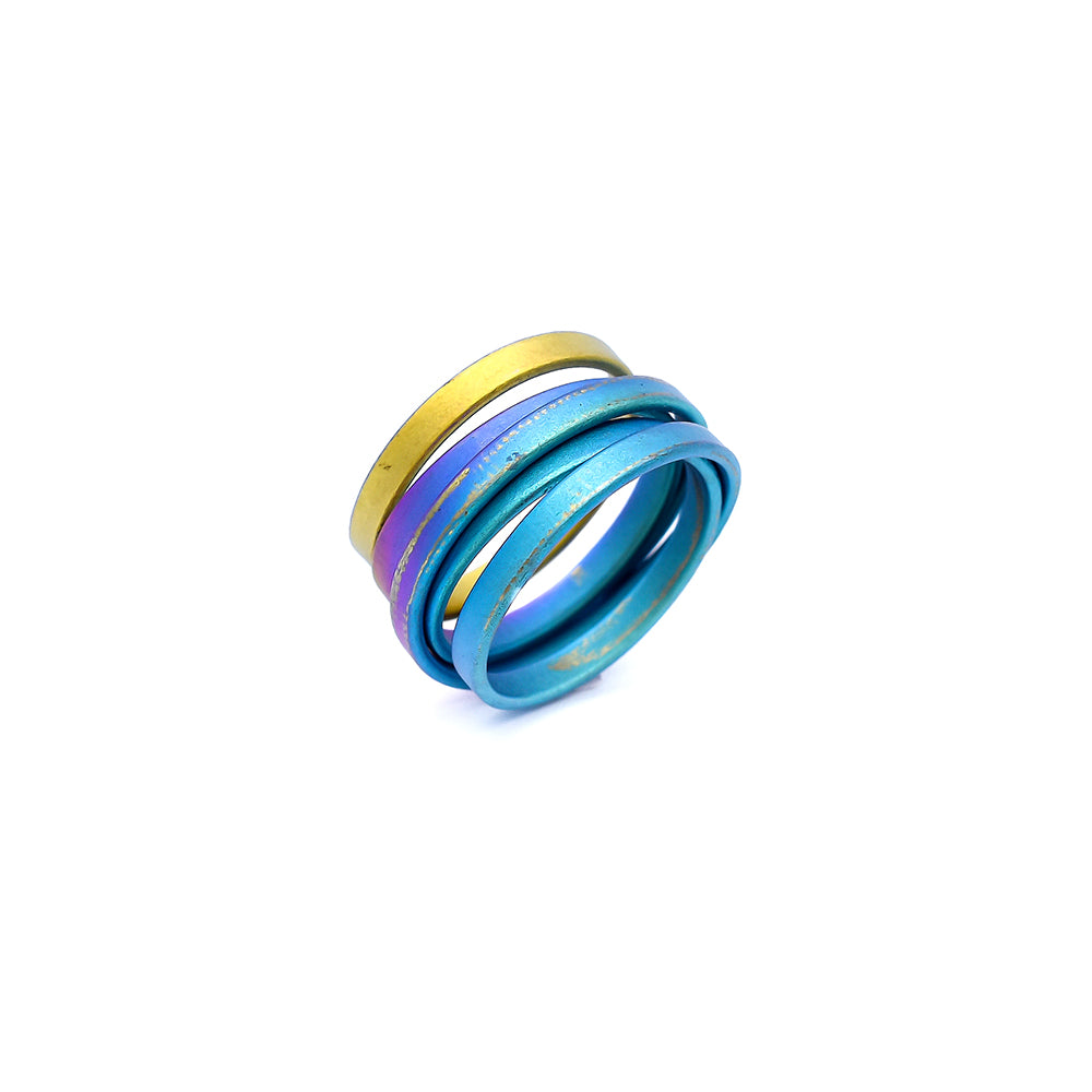 Πολύχρωμο δαχτυλίδι από ανοδιωμένο τιτάνιο σε μοντέρνο ελικοειδές σχέδιο που αναζωπυρώνει μία παιδικότητα και μία ζωντάνια.