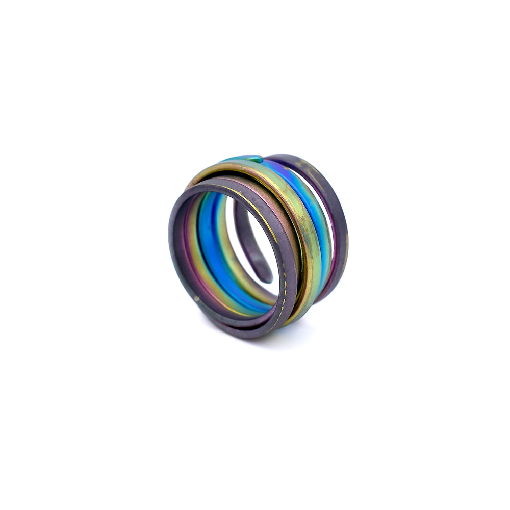 Πολύχρωμο δαχτυλίδι από ανοδιωμένο τιτάνιο σε μοντέρνο ελικοειδές σχέδιο που αναζωπυρώνει μία παιδικότητα και μία ζωντάνια.