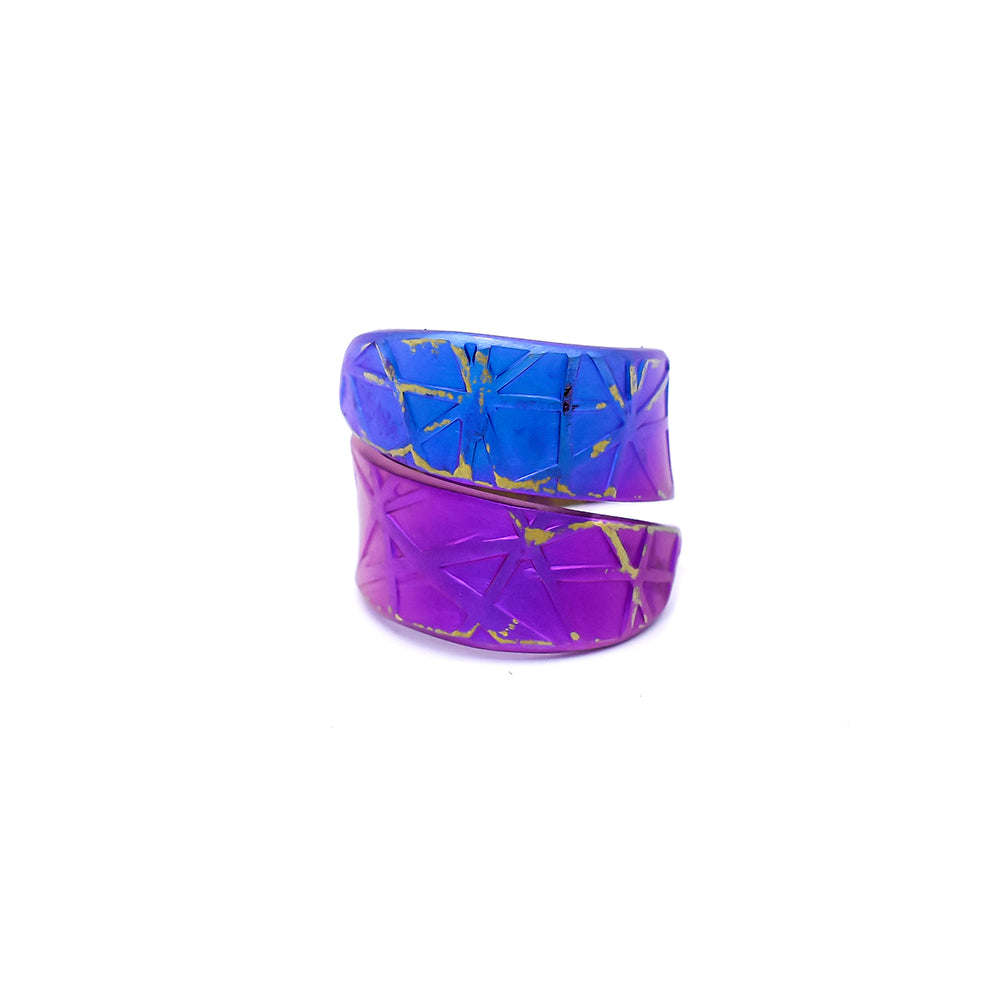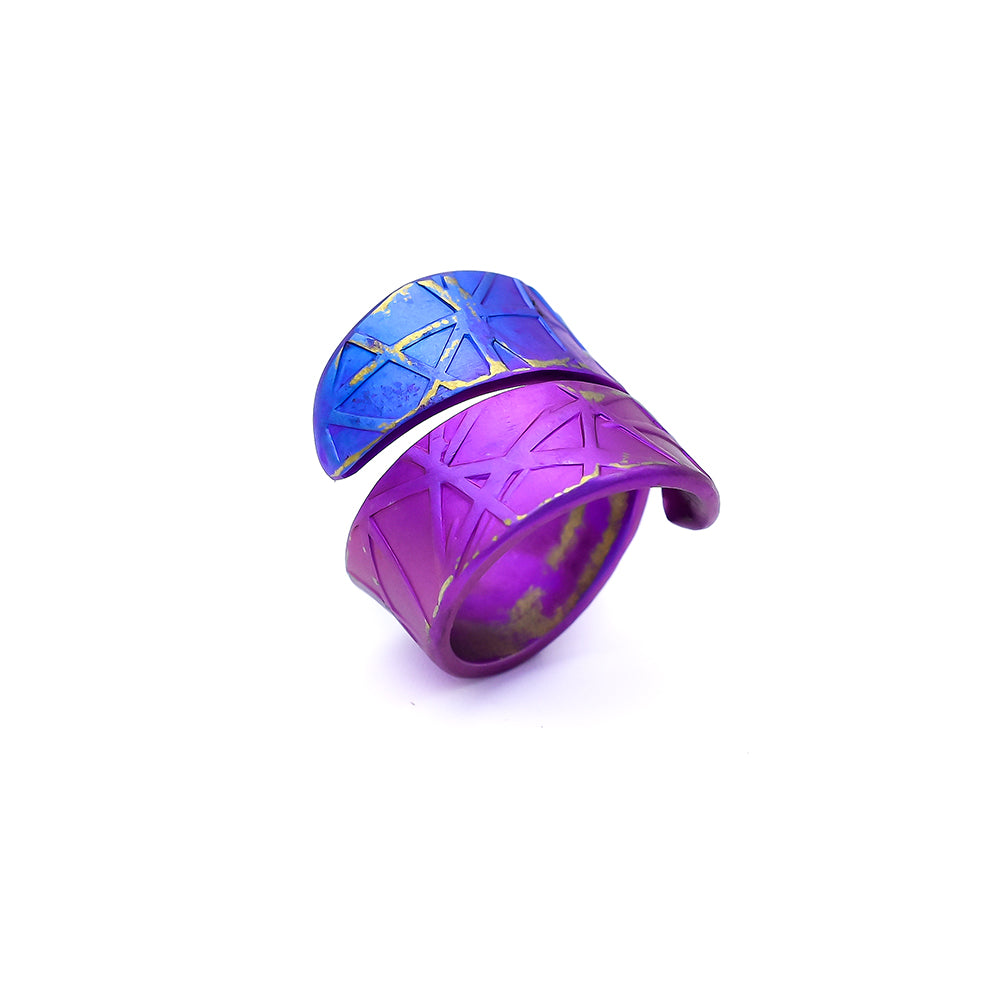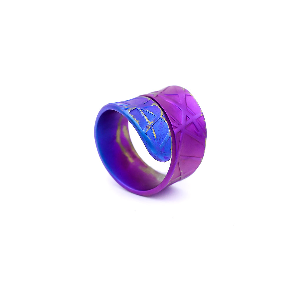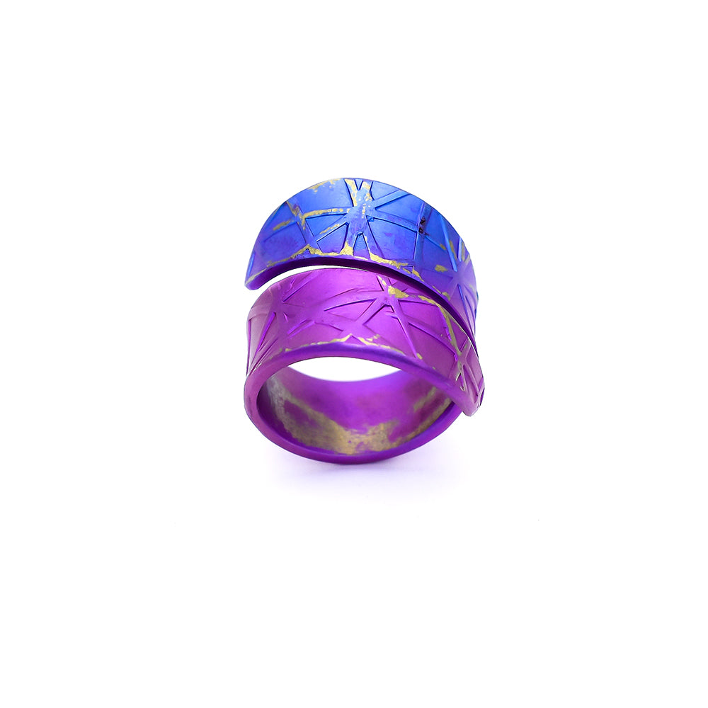 Ρυθμιζόμενο δαχτυλίδι τιτανίου με ανάγλυφες λεπτομέρειες και μία μεθυστική διχρωμία, που εκπέμπει μία μυστηριώδη φωτεινότητα.