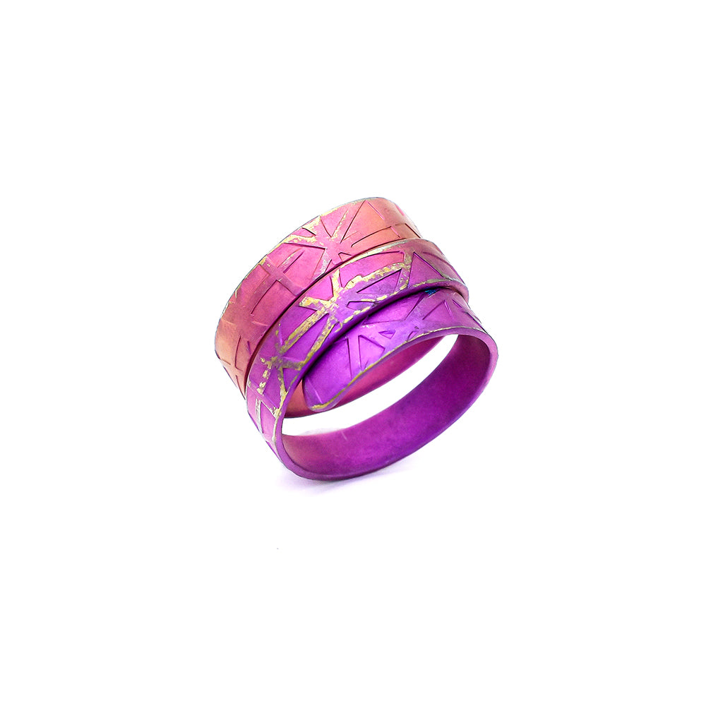 Ρυθμιζόμενο δαχτυλίδι από ανοδιωμένο τιτάνιο σε μοντέρνα περίπλεξη, που σε συνδυασμό με το δυναμικό χρώμα του, χαρίζει λάμψη και εκπέμπει ζωντάνια.