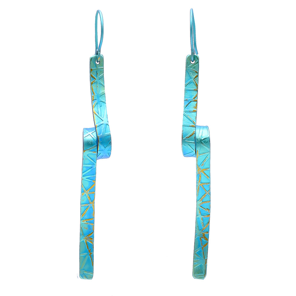 Σκουλαρίκια τιτανίου σε ιριδίζον τιρκουάζ χρώμα, που καθώς είναι εμπνευσμένα από το χορό του μπαλέτου, είναι σχεδιασμένα να αιχμαλωτίζουν τον παρατηρητή με τις λεπτές φινετσάτες γραμμές τους.