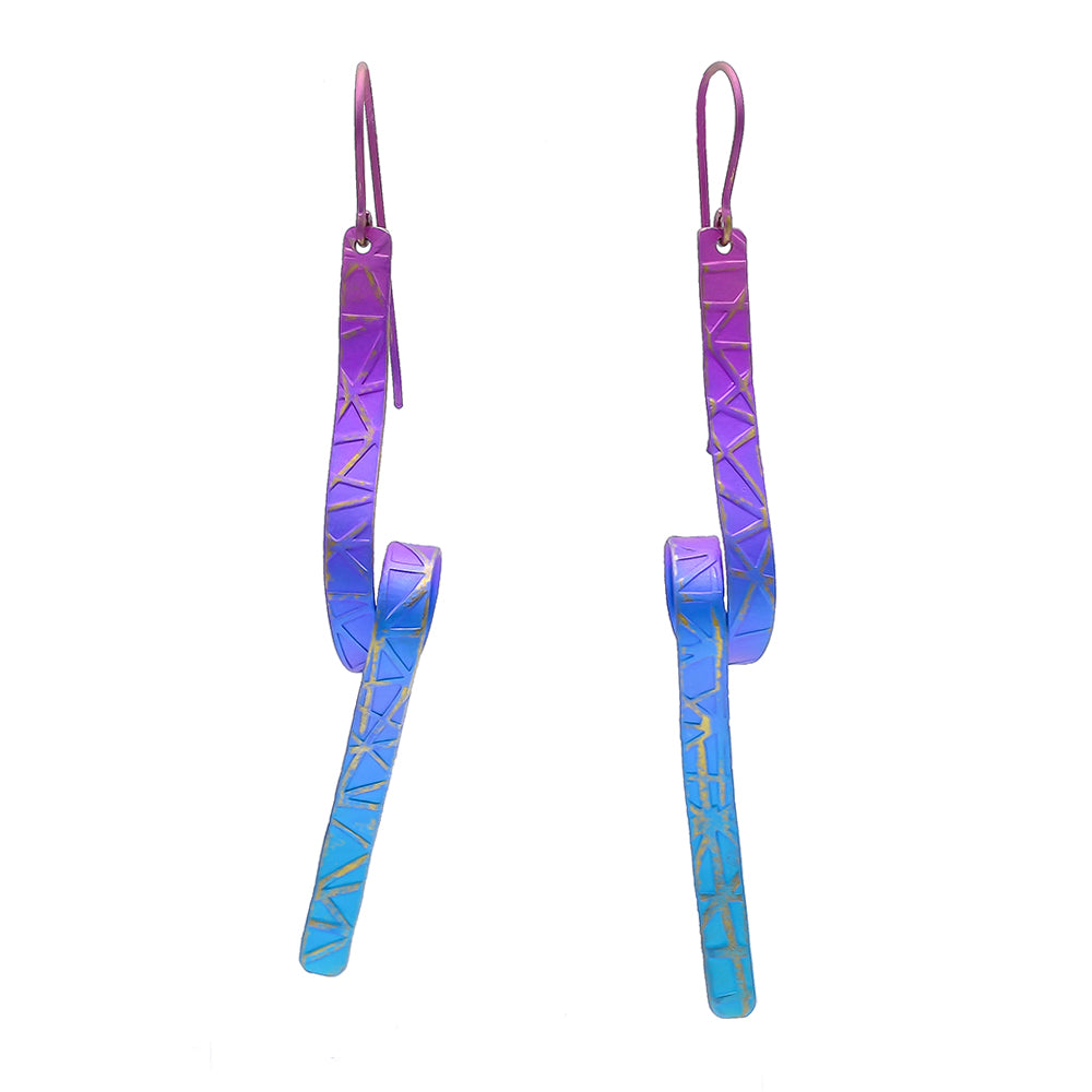 Σκουλαρίκια τιτανίου σε ιριδίζον μωβ - μπλε χρώμα, που καθώς είναι εμπνευσμένα από το χορό του μπαλέτου, είναι σχεδιασμένα να αιχμαλωτίζουν τον παρατηρητή με τις λεπτές φινετσάτες γραμμές τους.