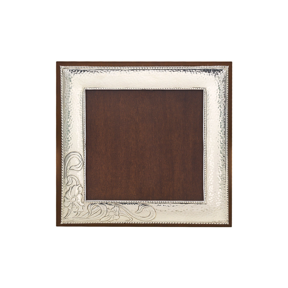 Τετράγωνη κορνίζα σε silver film με όμορφη λεπτομέρεια στην κάτω γωνία της και με ξύλινη πλάτη.