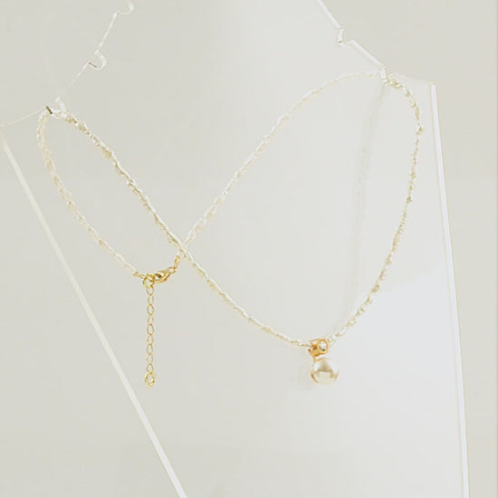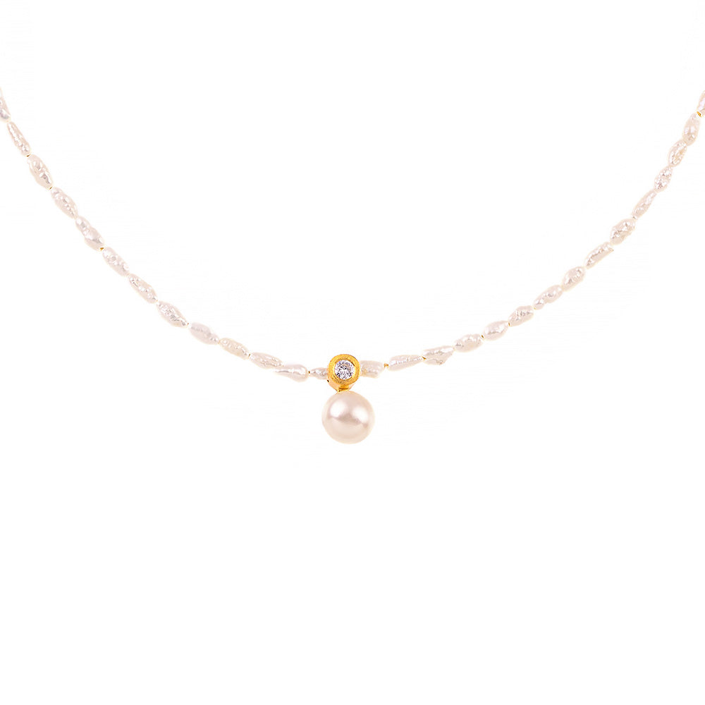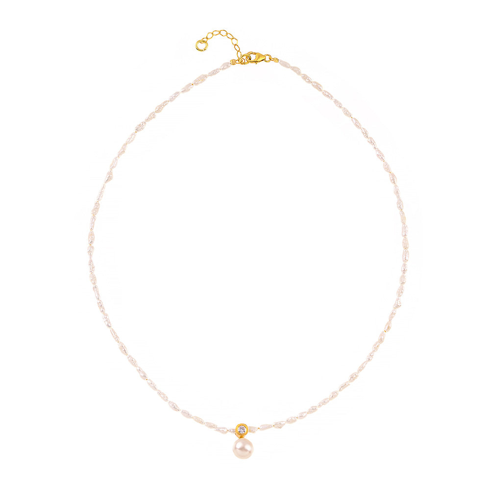Ασημένιο κολιέ 925ο, από μαργαριτάρια του γλυκού νερού σε μοντέρνο σχήμα, και ένα φινετσάτο κρεμαστό μαργαριτάρι που συνοδεύεται από ένα λευκό ζιργκόν. Ένα από τα πιο σικάτα κοσμήματα, σχεδιασμένο να αναπαύεται με χάρη στο λαιμό σας.